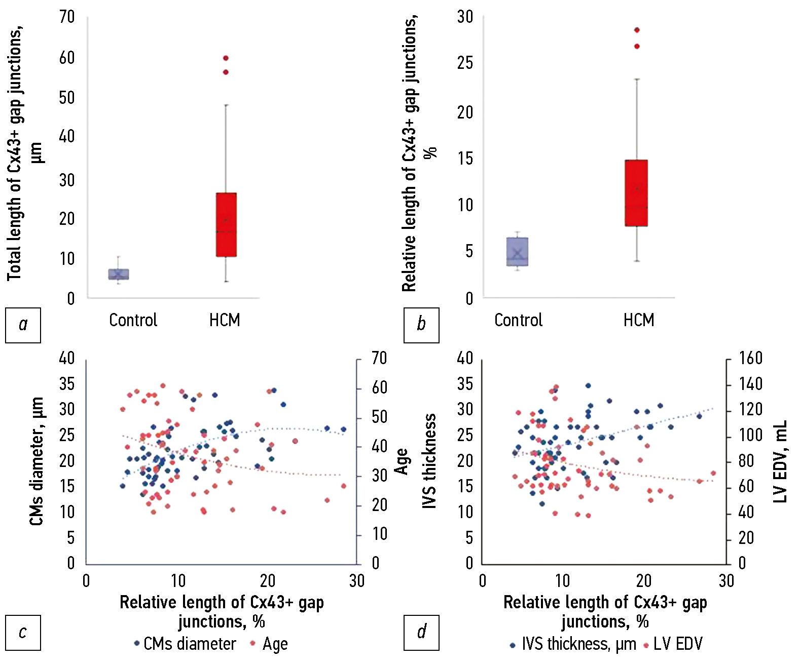 Fig. 2. Total (a) and relative (b) length of Cx43+ gap junctions in the cardiomyocytes of patients with hypertrophic cardiomyopathy. Correlations of the relative length of Cx43+ gap junctions in the cardiomyocytes of patients with hypertrophic cardiomyopathy with the cardiomyocytes diameter and the age of patients (c, r = 0.60; p < 0.0001 and r = –0.26; p = 0.038) and the interventricular septum thickness and left ventricular end-diastolic volume (d, r = 0.38; p = 0.004 and r = –0.28; p = 0.036).