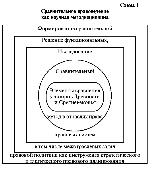 Таким образом, изложенные позиции свидетельствуют о том, что сравнительное правоведение в силу своей правосистемной мозаичности, всеобъемлющей мультиотраслевой природы и межпредметной теоретической и практической сложности решаемых задач заслуживает того, чтобы называться научной комплексной дисциплиной (схема 1).