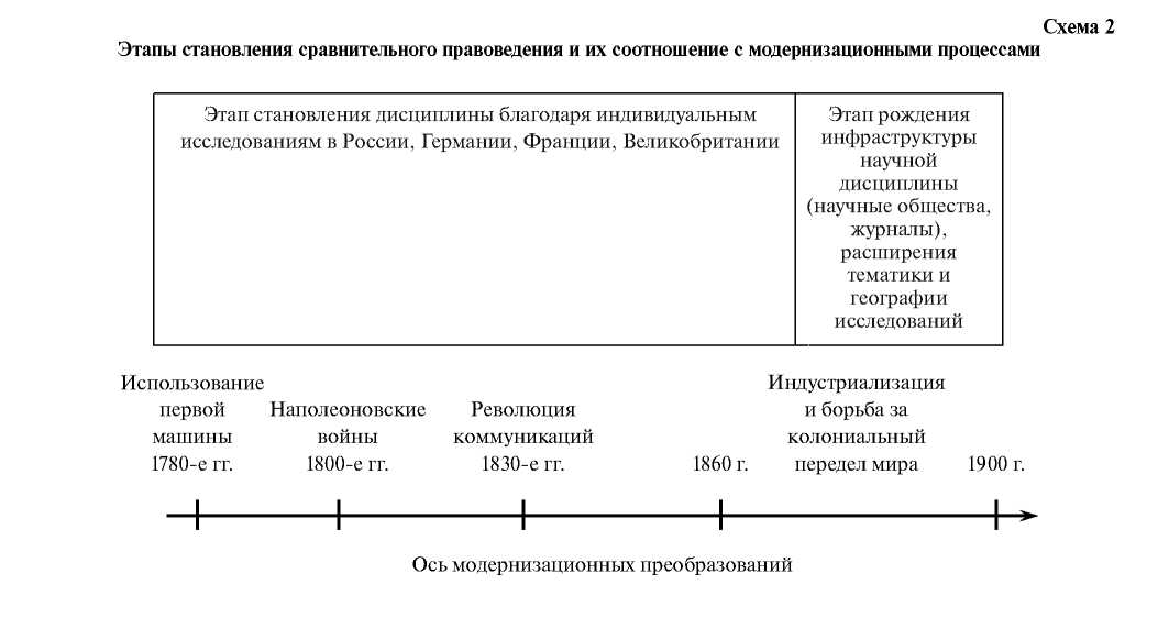 В целом же события в сфере сравнительного правоведения в XIX в. можно подразделить на следующие этапы, детерминировав их с модернизационными процессами (схема 2).