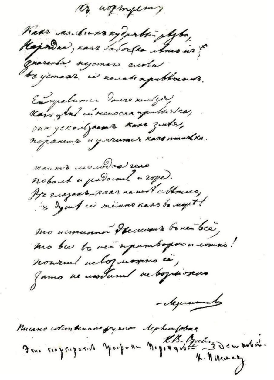Илл. 2. 1-й беловой автограф стихотворения М. Ю. Лермонтова «К портрету» (1840)5