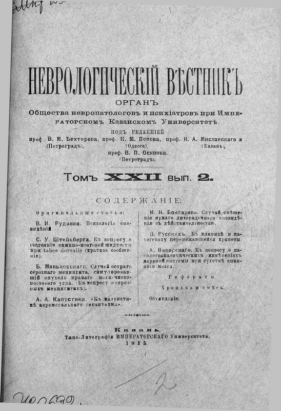 Діагностическое значеніе изслѣдованій спинномозговой жидкости вообще и реакцій Nonne-Apelt’a, изслѣдованія плеоцитоза и реакціи Wassermann’a въ частности, давно завоевали права гражданства при выясненіи характера большинства органическихъ заболѣваній нервной системы, особенно же заболѣваній сифилитическихъ и парасифилитическихъ, въ числѣ послѣднихъ и tabes dorsalis.