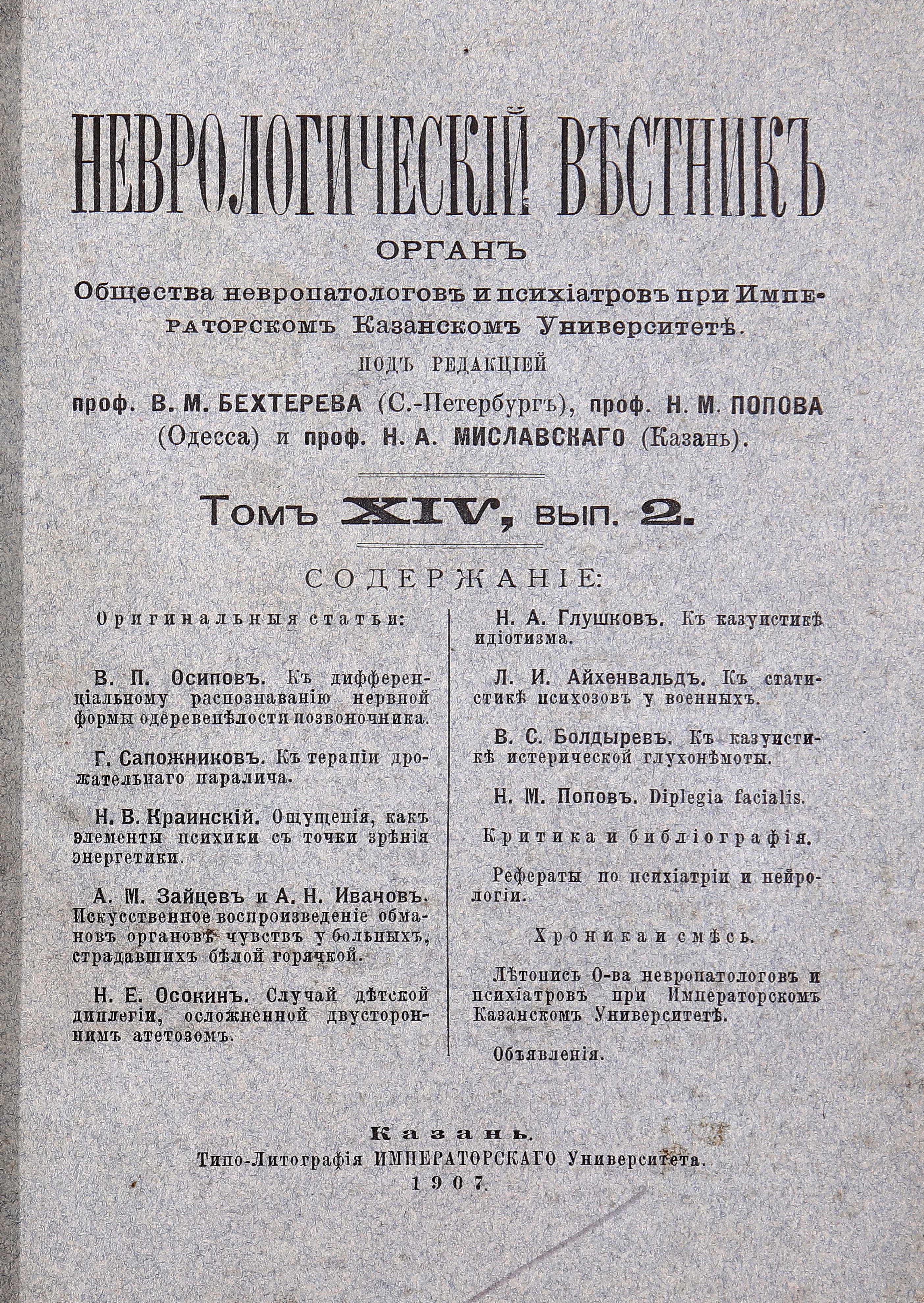 Въ первой (мартовской) книжкѣ журнала имѣется чрезвычайно интересная статья В. А. Муратова: „Заболѣваніе надпочечниковъ при періодическомъ психозѣ“.