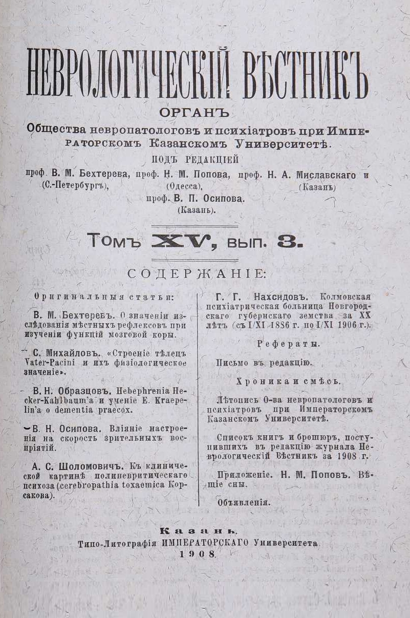 Лѣтопись общества невропатологовъ и психіатровъ при Императорскомъ Казанскомъ Университетѣ. Том XV, № 3 (1908)