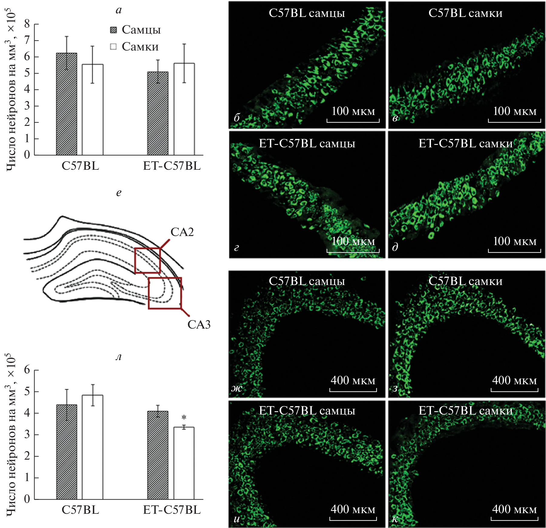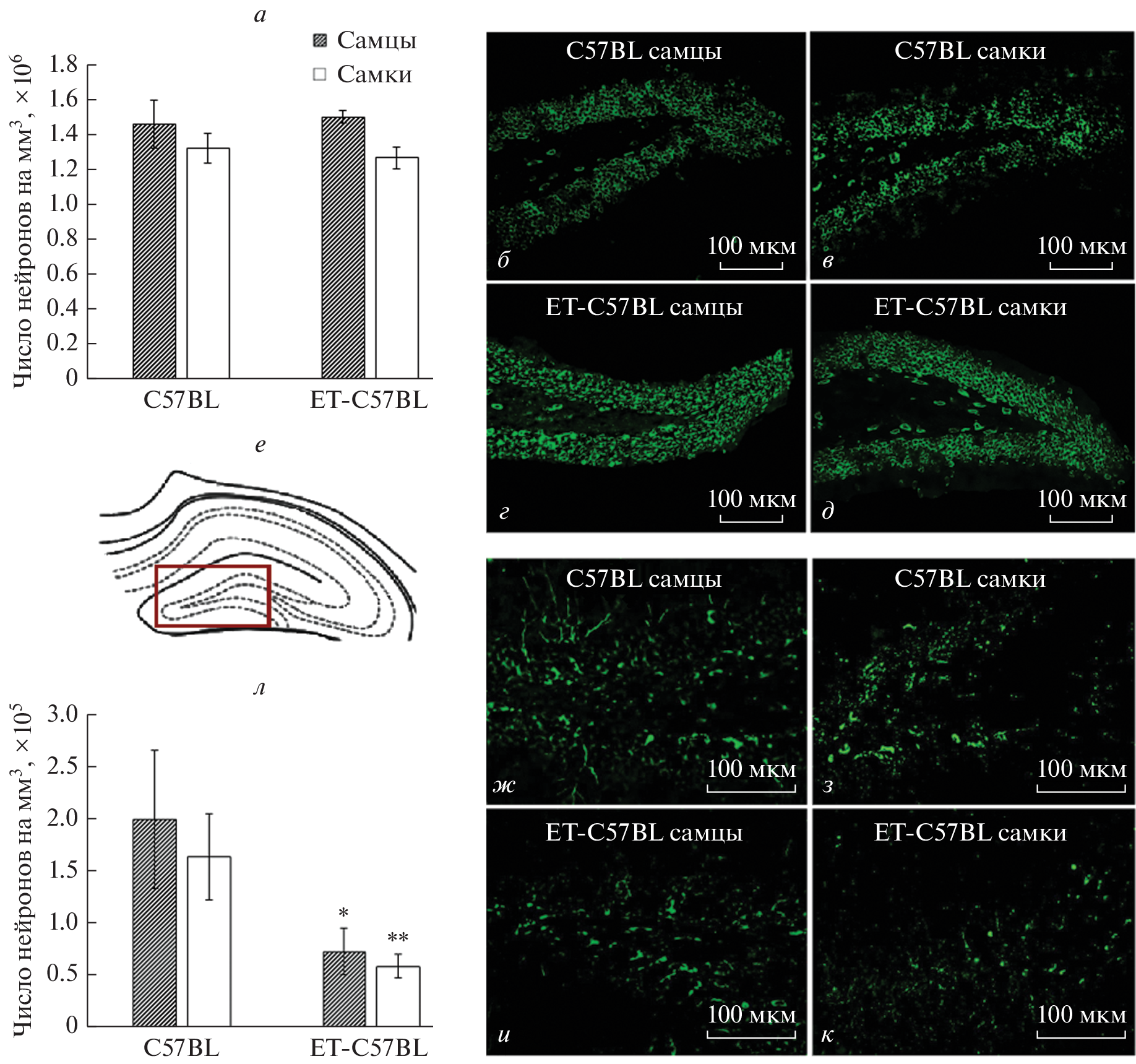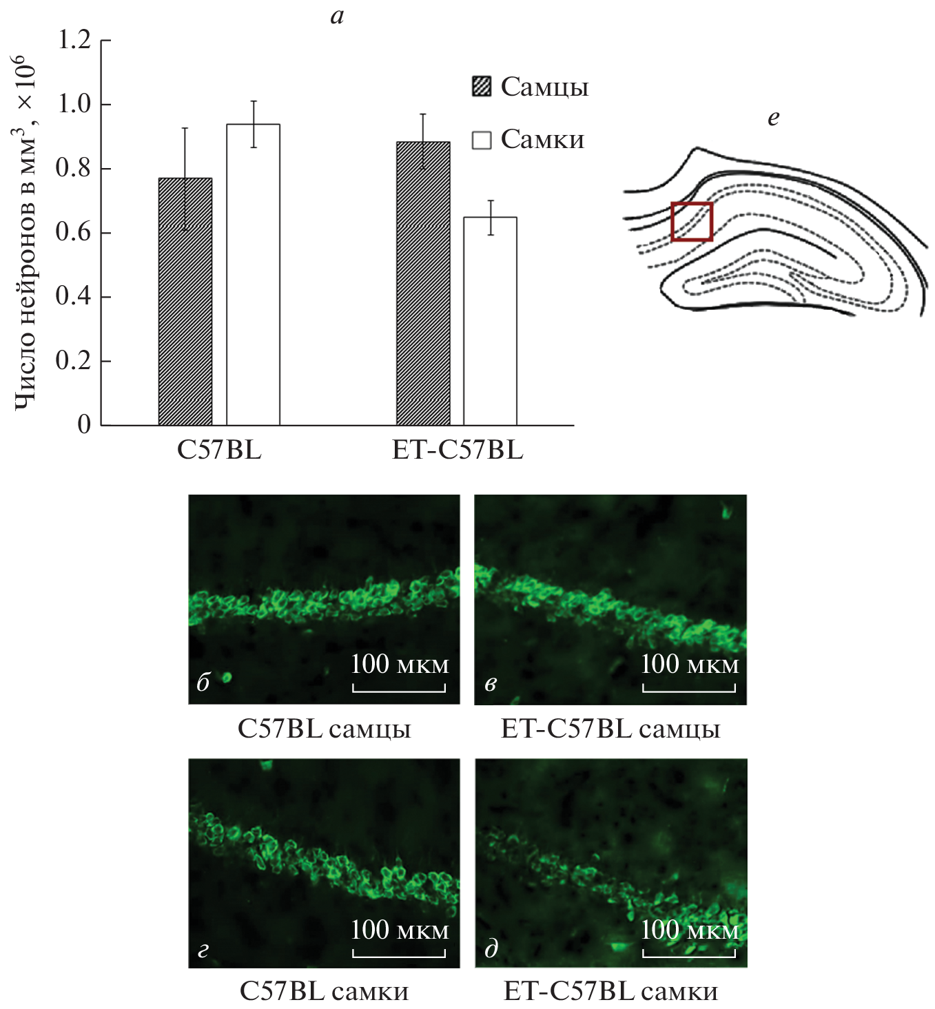 The current research is aimed to determine the long-term effects of the in vitro culture (IVC) and embryo transfer (ET) on the neonatal offspring development, as well as on the adult hippocampal neuronal densities, as well hippocampal neurogenesis in С57BL/6J mice. Offspring of naturally born C57BL/6J mice (C57BL group) were compared with C57BL/6J mice born as a result of the IVC combined with ET to C57BL/6J recipient females (ET-C57BL group). At age of 3 mo., no group differences were observed in the body weight and brain-to-body ratio, although sex differences in these variables were observed. The offspring of both sexes born after IVC-ET exhibited the lower level of neurogenesis in the dentate gyrus (DG) of the hippocampus as compared to the control C57BL group. To conclude, IVC and ET exerted no major effects on body and brain weight in offspring, but affected hippocampal neurogenesis in the adult offspring of both sexes. Besides, the number of pyramidal neurons in the CA3 area of hippocampus was lower in female offspring of ET-C57BL group.