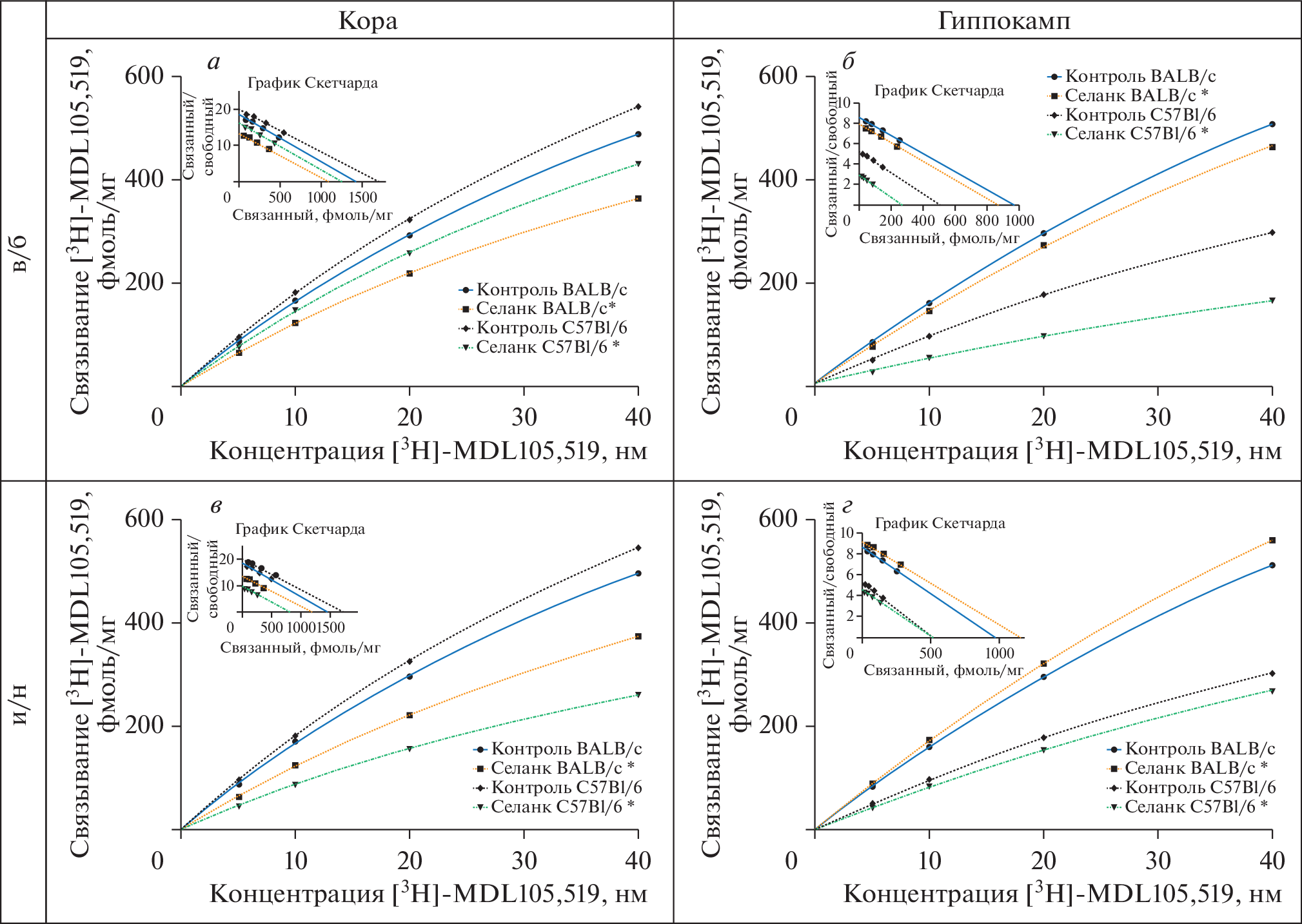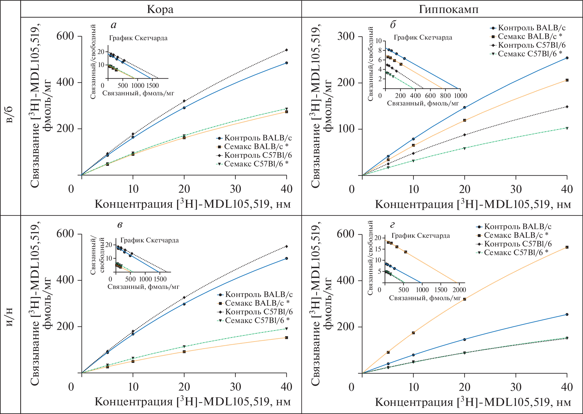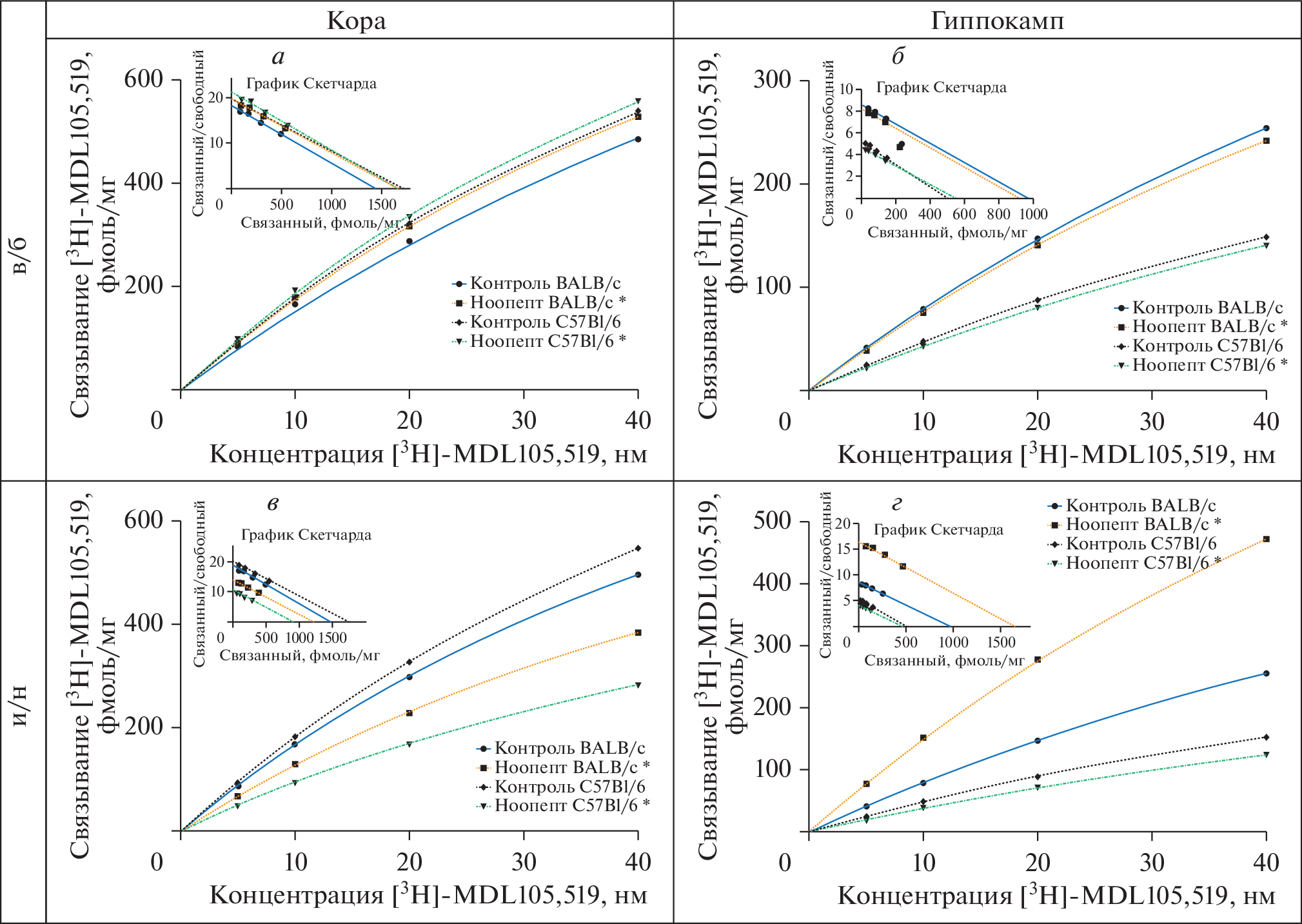The effects of the nootropic peptides selank (300 mg/kg), noopept (1 mg/kg), and semax (0.6 mg/kg) after subchronic intraperitoneal (i.p.) and intranasal (i.n.) administration on the binding of [3H]-MDL105,51 to NMDA glycine site in BALB/c and C57Bl/6 mice brain were examined. It was found that in C57Bl/6 mice in comparison with BALB/c the number of glycine binding sites (Bmax) at baseline was 15% higher in the cortex and 47% lower in the hippocampus. In the cortex i.n. administration of selank, noopept, and semax resulted in 18, 19, and 66% decrease in the number of glycine binding sites in BALB/c mice, and in 53, 49, and 66% in C57Bl/6 mice, respectively. In the hippocampus i.n. administration of selank, noopept, and semax resulted in 15, 63, and 95% increase in the number of glycine binding sites in BALB/c mice, respectively, while in C57Bl/6 mice all three peptides were not effective. In the cortex i.p. administration of selank and semax decreased glycine binding sites by 24 and 40% in the cortex and by 11 and 19% in the hippocampus in BALB/c mice, while in C57Bl/6 mice the reduction was 15% and 47% in the cortex and 45 and 24% in the hippocampus, respectively. Noopept did not affect the binding. These patterns observed in the cortex after i.n. and i.p. administration appear to be common to the both mice strains suggesting an engagement of the cortical NMDA glycine site in action(s) that underlie some common pharmacological effects of the selected peptides. Whereas the specific effect of selank, noopept, and semax after i.n. administration in the BALB/c hippocampi may be associated with the mechanisms of nootropic and anxiolytic activities of these peptides manifested in that mice strain.