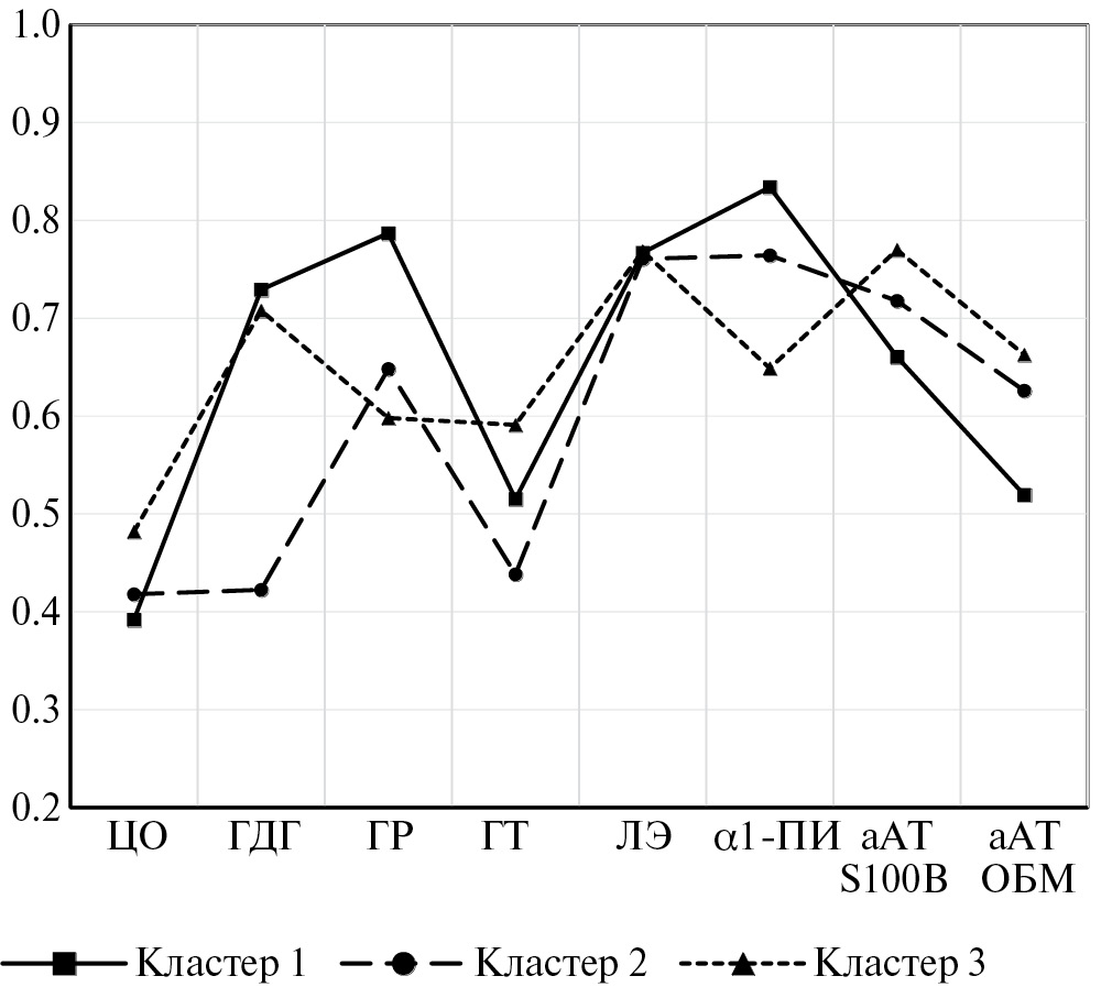 Для решения поставленной задачи в работе был использован кластерный анализ с предварительным нормированием по максимуму значений иммунологических (ЛЭ, α1-ПИ, аАТ к S100B и ОБМ) и биохимических (ЦО, ГДГ, ГР, ГТ в тромбоцитах) показателей. Заданное число кластеров составило 3, число итераций было равно 2 [33]. Графическое изображение кластеров (Кластер 1 (n = 21), Кластер 2 (n = 30), Кластер 3 (n = 23)) представлено на рис. 1, а их характеристики – в табл. 2.