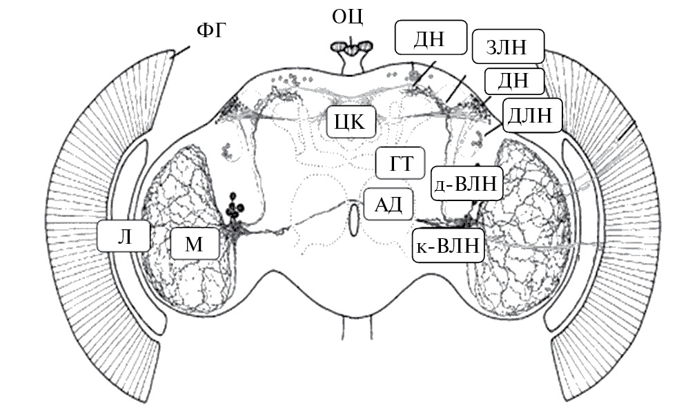 Рис. 2. Система циркадных осцилляторных нейронов мозга дрозофилы: АД – антеннальные доли; ФГ – фасеточные глаза; Л – ламина; М – медула; ГТ – грибовидное тело; ЦК – центральный комплекс; ОЦ – оцелли; к-ВЛН – короткие вентро-латеральные нейроны; д-ВЛН – длинные вентро-латеральные нейроны; ДЛН – дорзо-латеральные нейроны; ДН – дорсальные нейроны; ЗЛН – задне-латеральные нейроны (адаптировано по Helfrich-Förster, 2005).