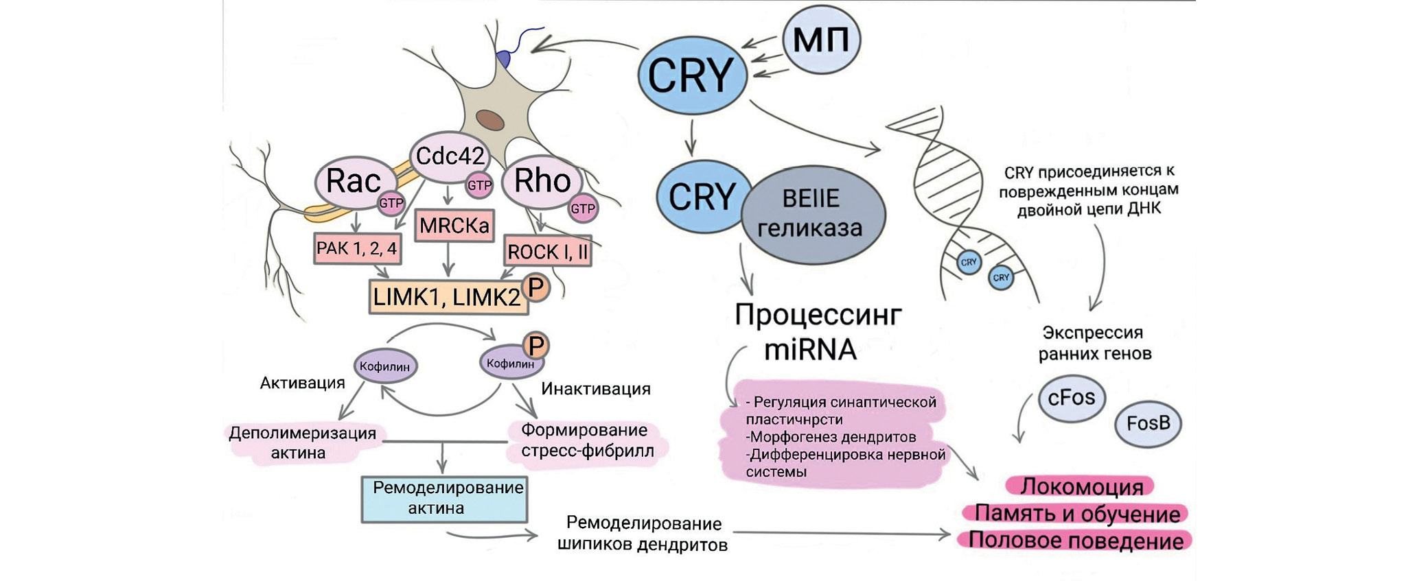 Оказалось, что низкий уровень LIMK1 способствует обучению в парадигме условно-рефлекторного подавления ухаживания, но не формированию среднесрочной памяти. В то же время у линии с повышенным содержанием LIMK1 стрессорное воздействие восстанавливает способность к обучению и формированию памяти [37]. Таким образом, уровень LIMK1 дофамин- и серотонинергических нейронов значим для стрессорного ответа как на геномном, так и на поведенческом уровнях. В работе Карки с соавторами показано, что CRY-зависимые от магнитного поля эффекты проявляются в спайковой активности нейронов, локомоторной активности и поведении в Т-образных лабиринтах [5]. Каждый из вышеперечисленных феноменов вносит вклад в условно-рефлекторное подавление ухаживания. Полученные нами данные свидетельствуют о важной роли дофаминовых и серотониновых нейронов в рецепции магнитных и световых воздействий посредством ремоделирования актинового цитоскелета и изменения паттерна ДЦР. По материалам литературных и собственных данных можно предложить следующую гипотетическую схему влияния на организм магнитного поля через магнитосенсор CRY (рис. 5).