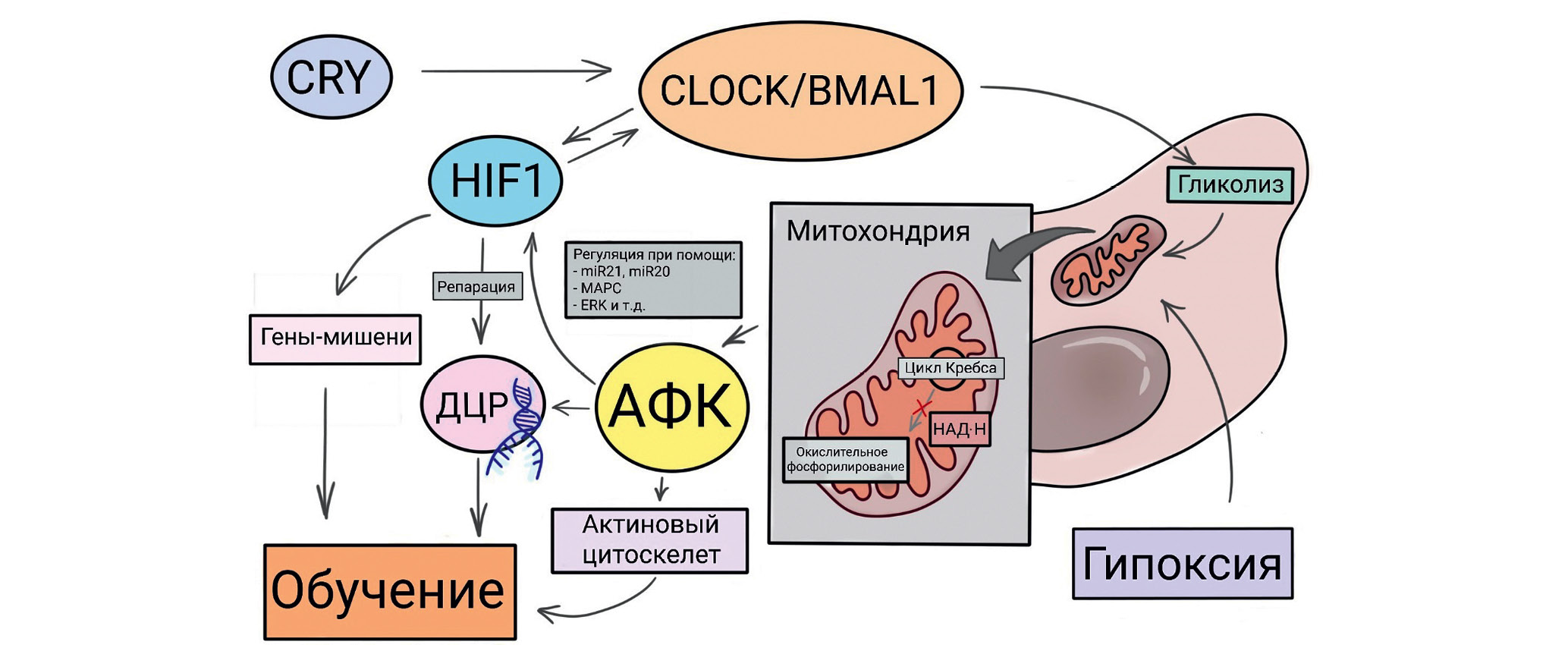 Циркадные часы тесно связаны с гипоксическим сигнальным путем. Суточная осцилляция гликолитических метаболитов, а также циркадные колебания соотношений основных клеточных окислительно-восстановительных элементов НАД+/НАДН и НАДФ+/НАДФН нарушаются при гипоксии. Существует двунаправленная связь на молекулярном, физиологическом и организменном уровне [45]. Известно, что промотор ключевого транскрипционного регулятора адаптации к кислородному голоданию – HIF1 содержит регуляторный мотив для генов контроля суточного ритма [46]. При этом HIF1 непосредственно связывается с промоторами ключевых циркадных генов [47]. CRY, контролирующий циркадные ритмы через гетеродимер CLOCK/BMAL1 (гомологичен CLK/CYC дрозофилы), ограничивает транскрипцию чувствительных к гипоксии генов посредством репрессии гетеродимеров HIF1α-BMAL1 [48].