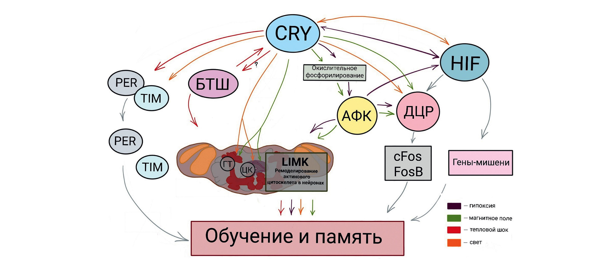 Все четыре фактора внешней среды – освещение, геомагнитное поле, температура, давление – содержание кислорода оказались связаны между собой не только общим сенсором – CRY, выполняющим функции синхронизатора часовых ритмов, температуры, гипоксии, но и общей мишенью – динамикой актинового цитоскелета. На уровне генетического аппарата такой мишенью является ДНК, которая реагирует на стрессорные и когнитивные вызовы формированием разрывов. Гипотетическая схема роли CRY – сенсора экологически значимых стрессорных факторов представлена на рис. 8.