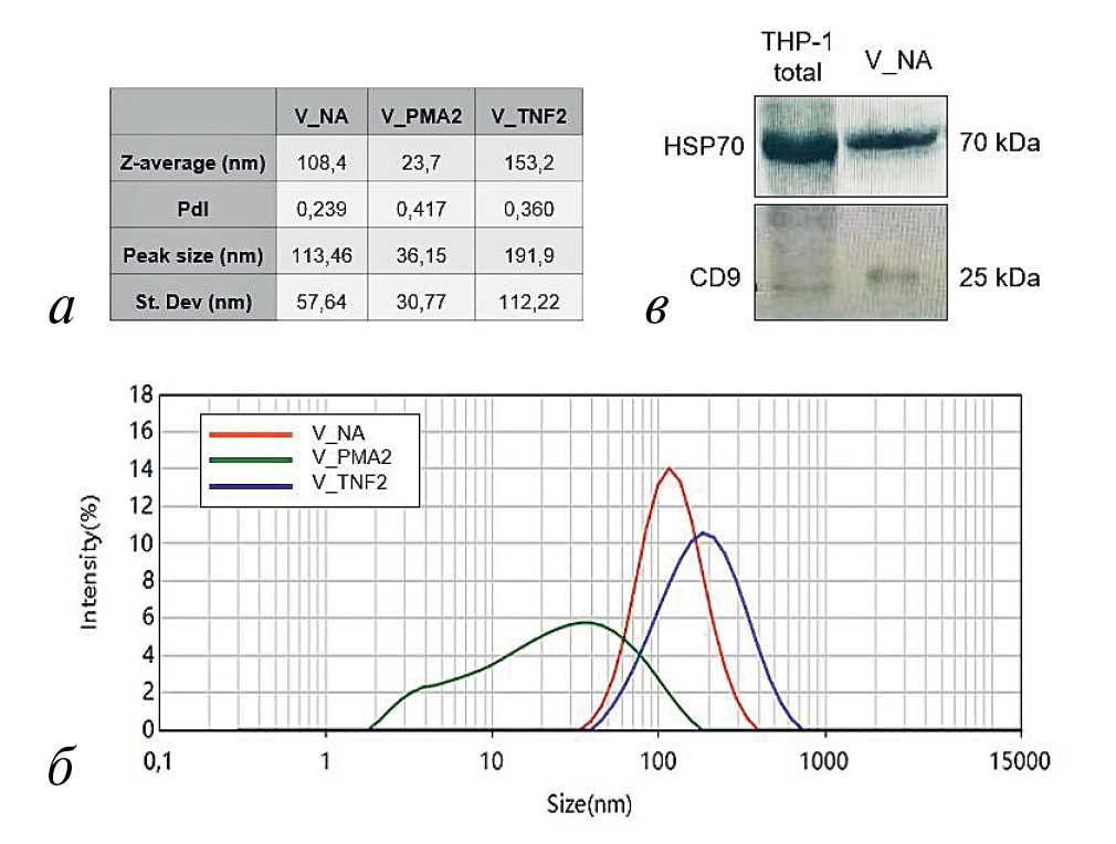 Рис. 2. Характеристика внеклеточных везикул, секретируемых клетками THP-1. Размер внеклеточных везикул (а) и дисперсность (б), оцененные по результатам использования метода динамического рассеяния света. Результаты вестерн-блот анализа (в), выполненного с антителами к белку теплового шока 70 (HSP70) и мембранному гликопротеину семейства тетраспанинов CD9. Обозначения: V_NA – ВВ, секретируемые неактивированными клетками THP-1; V_РМА2 – ВВ, секретируемые клетками THP-1 при стимуляции РМА в концентрации 50 нг/мл; V_TNF2 – ВВ, секретируемые клетками THP-1 при стимуляции TNF в концентрации 20 нг/мл; THP-1 total – лизат клеток.
