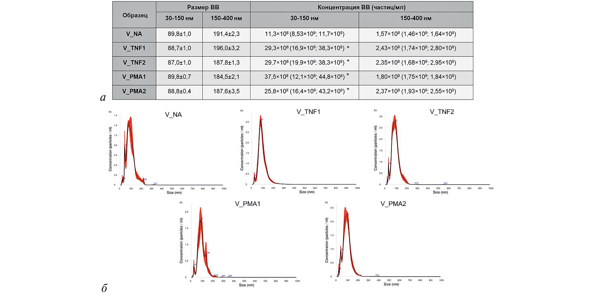 Рис. 3. Средние размеры и концентрация ВВ, секретируемых клетками ТНР-1, рассчитанные по результатам анализа траектории наночастиц в диапазонах 30–150 и 150–400 нм: а – таблица размер/концентрация продуцируемых внеклеточных везикул в диапазоне 30–150 и 150–400 нм; б – графики размер/концентрация ВВ, секретируемых THP-1 клетками при активации TNF и PMA в разных концентрациях. Обозначения: V_NA – ВВ, секретируемые неактивированными клетками THP-1; V_РМА1 – ВВ, секретируемые клетками THP-1 при стимуляции РМА в концентрации 16 нг/мл; V_РМА2 – ВВ, секретируемые клетками THP-1 при стимуляции РМА в концентрации 50 нг/мл; V_TNF1 – ВВ, секретируемые клетками THP-1 при стимуляции TNF в концентрации 10 нг/мл; V_TNF2 – ВВ, секретируемые клетками THP-1 при стимуляции TNF в концентрации 20 нг/мл.