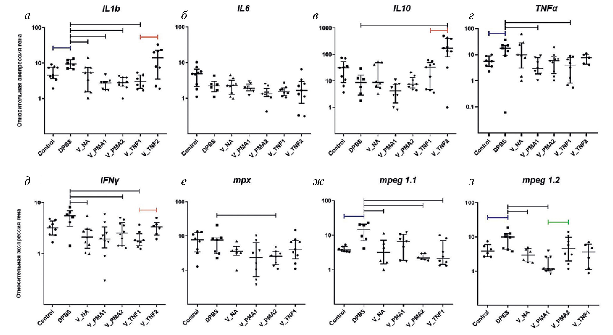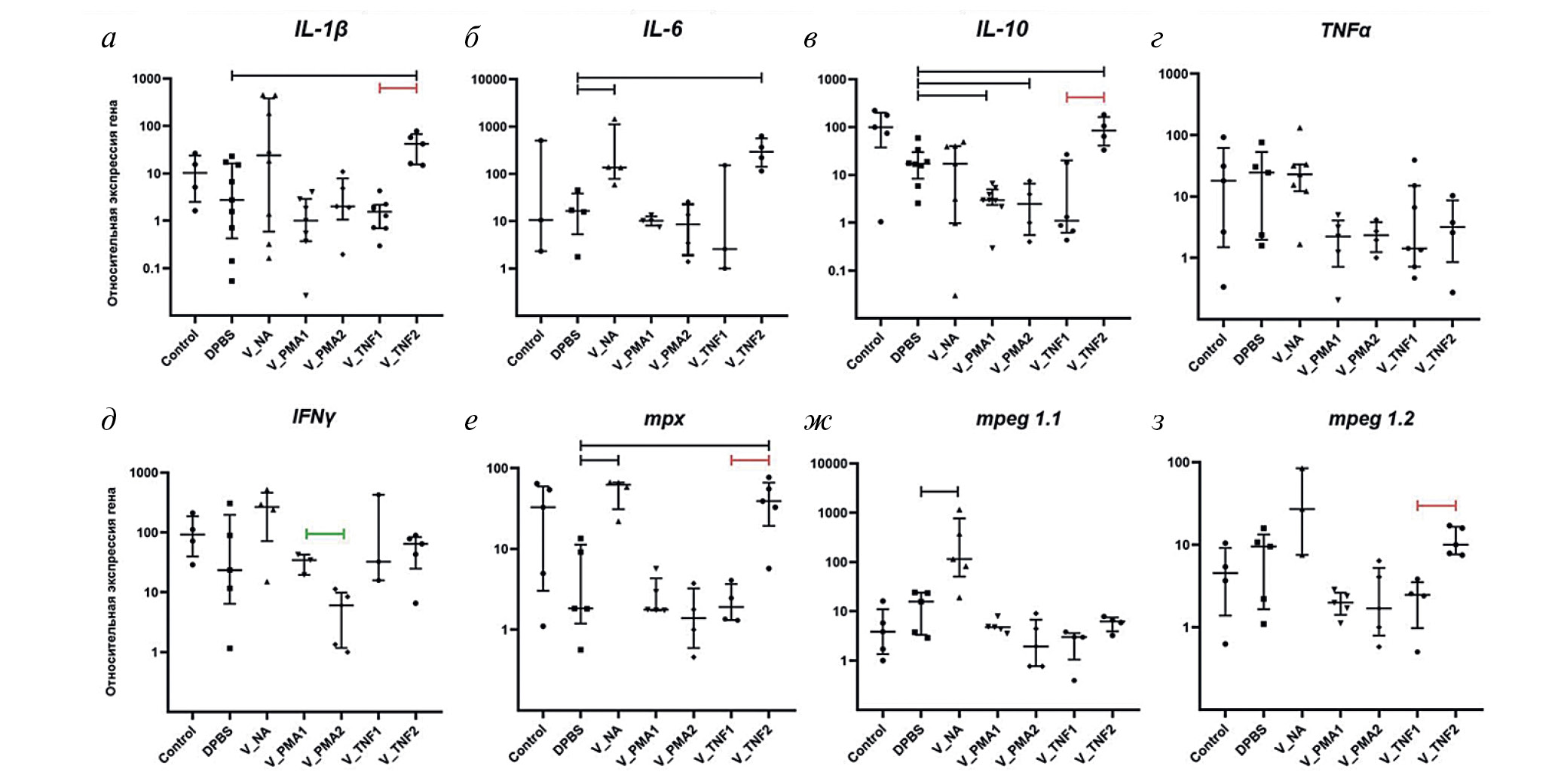 Рис. 5. Относительная экспрессия генов il-1β (а), il-6 (б), il-10 (в), tnf-α (г), ifn-γ (д), mpx (е), mpeg1.1 (ж), mpeg1.2 (з) в образцах мозга рыб Danio rerio исследуемых групп: Control – интактные рыбы; DPBS – инъекция раствора DPBS; V_NA – инъекция ВВ, секретируемых неактивированными клетками THP-1; V_РМА1 – инъекция ВВ, секретируемых клетками THP-1 при стимуляции РМА в концентрации 16 нг/мл; V_РМА2 – инъекция ВВ, секретируемых клетками THP-1 при стимуляции РМА в концентрации 50 нг/мл; V_TNF1 – инъекция ВВ, секретируемых клетками THP-1 при стимуляции TNF в концентрации 10 нг/мл; V_TNF2 – инъекция ВВ, секретируемых клетками THP-1 при стимуляции TNF в концентрации 20 нг/мл.