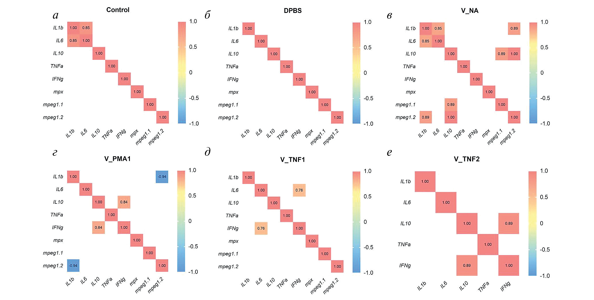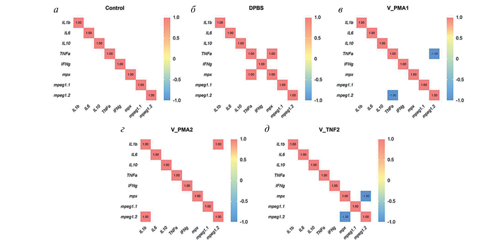 Корреляционный анализ выявил положительные связи между уровнями экспрессии генов в группе контроля (рис. 6, a); в группе V_NA (рис. 6, в); в группах V_PMA1 (рис. 6, г), V_TNF1 (рис. 6, д) и V_TNF2 (рис. 6, е). Отрицательная корреляция наблюдалась только в группе V_PMA1 между уровнями экспрессии генов il-1β и mpeg1.2.