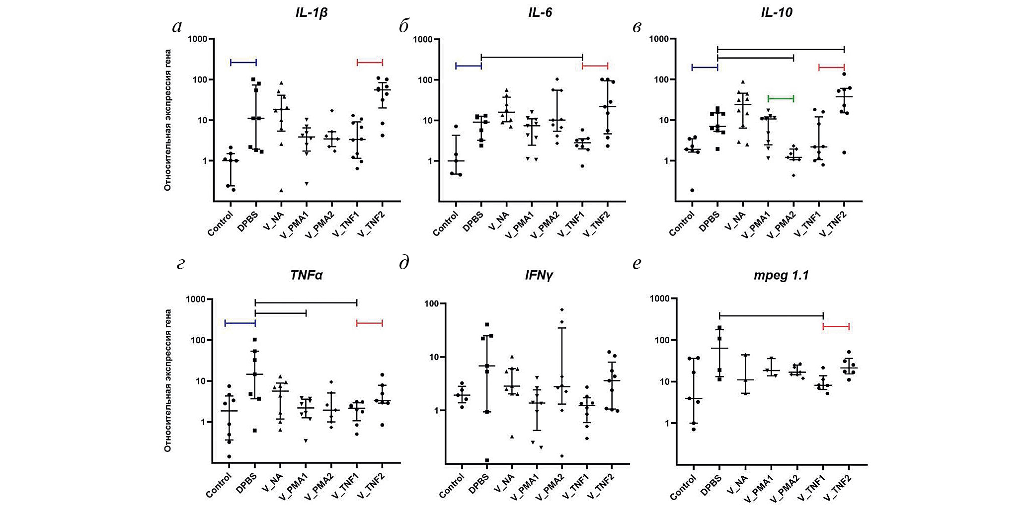 Инъекции ВВ в группах V_TNF1 и V_TNF2 оказывали разнонаправленные эффекты относительно группы DPBS на экспрессию генов il-1β, il-6, il-10. Везикулы группы V_TNF1 приводили к снижению уровня экспрессии, в то время как везикулы V_TNF2 – к повышению. Аналогичную закономерность можно отметить у ВВ из групп V_PMA1 и V_PMA2 в отношении экспрессии генов il-6 и il-10 (см. рис. 7).