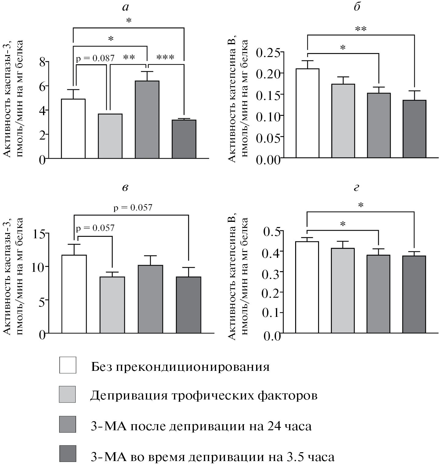 Экспрессия ферментов семейства каспаз хотя и прямо коррелирует с выраженностью апоптотических процессов в клетке, но метод Вестерн блот является далеко не самым чувствительным. В своих работах мы стараемся дополнять этот метод более чувствительным методом определения ферментативной активности с использованием флуориметрического субстрата. Активность каспазы-3 перед действием глутамата представлена на рис. 2, а. Динамика активности этого фермента очень похожа на динамику экспрессии (см. рис. 1, г), при этом изменения выражены более отчетливо, что, в частности, подтверждается высоким уровнем достоверности отличий между группами. Еще одним ферментом, активность которого отражает выраженность физиологических процессов в клетке, является катепсин В, и его активность грубо коррелирует с числом и/или активностью лизосом в клетке. Активность катепсина В представлена на рис. 2, б. Заметно, что прекондиционирование снижает число лизосом в клетке (недостоверно), особенно под действием 3-МА. Снижение числа лизосом выражено примерно одинаково в группах с 3-МА, независимо от того, во время или после прекондиционирования клетки находились под действием 3-МА. Воздействие глутамата на клетки не сильно изменяет паттерн активности каспазы-3 (рис. 2, в) и катепсина В (рис. 2, г), при этом общий уровень активности увеличивается примерно в два раза во всех группах. Данная находка свидетельствует о том, что такой паттерн вырабатывается на раннем этапе после прекондиционирования и поддерживается в клетке долгое время, должно быть, за счет соответствующих изменений синтеза белка.