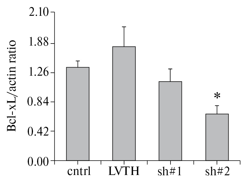 Оценку эффективности нокдауна каждого варианта shRNA проводили на первичных клетках фибробластов крысы с трансфекцией плазмидной ДНК с использованием Lipofectamine 2000 (Invitrogen). Только вариант sh#2 снижал экспрессию Bcl-xL в два раза по сравнению с контролем через 48 часов после трансфекции [F(3, 16)=5.3526, p=0.01] (рис. 1).