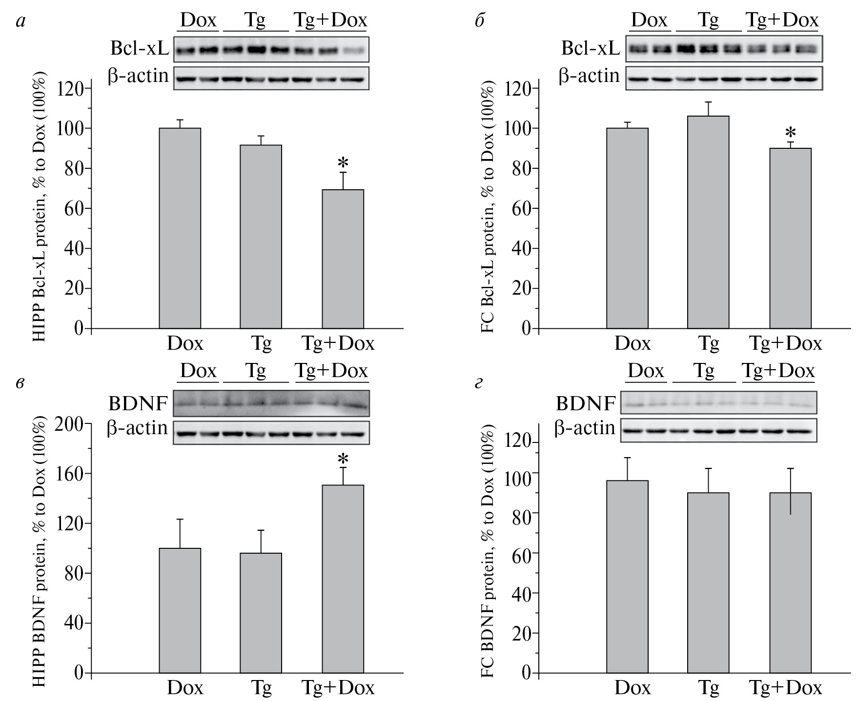 Рис. 2. Уровни белков Bcl-xL (a, б) и BDNF (в, г) в гиппокампе (a, в) и фронтальной коре (б, г) взрослых крыс, получавших внутригиппокампальные инъекции лентивирусного вектора и доксициклин с питьевой водой отдельно и совместно. Dox – доксициклин, Tg ‒ лентивирусный вектор, Tg+Dox ‒ лентивирусный вектор с последующим потреблением доксициклина. Значения M±m представлены в процентах относительно группы Dox, принятой за 100%; в каждой группе 7–8 животных. Звездочками указаны различия между группами: на (а) ‒ p < 0.05 по сравнению с группами Dox и Tg; на (б) ‒ p < 0.05 по сравнению с группой Dox, с группой Tg на уровне выраженной тенденции ‒ p = 0.0568; на (в) ‒ p < 0.05 по сравнению с обеими контрольными группами.