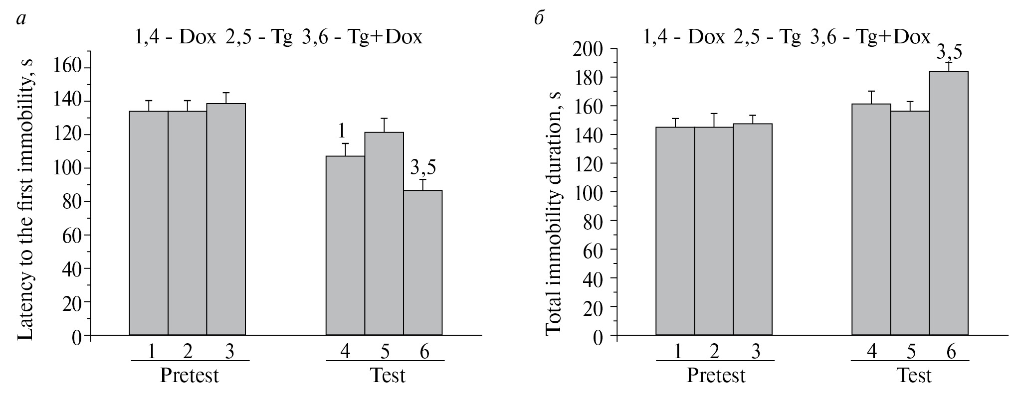 Рис. 3. Латентное время до первого замирания (а) и общая продолжительность замирания (б) взрослых крыс, получавших внутригиппокампальные инъекции лентивирусного вектора и доксициклин с питьевой водой отдельно и совместно, в претестовой и тестовой сессиях теста принудительного плавания. Dox – доксициклин, Tg ‒ лентивирусный вектор, Tg+Dox ‒ лентивирусный вектор с последующим потреблением доксициклина; в каждой группе 11–13 животных. Цифрами сверху указаны группы, между которыми выявлены достоверные отличия (p < 0.05).