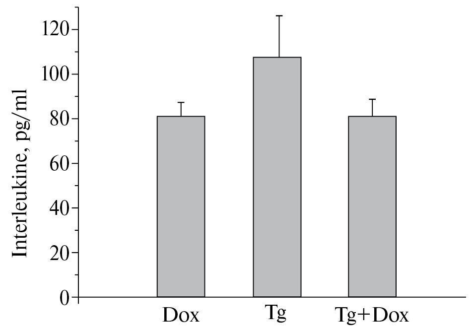 Рис. 5. Стресорные (через 30 минут после стресса принудительного плавания) уровни интерлейкина-6 в плазме периферической крови взрослых крыс, получавших внутригиппокампальные инъекции лентивирусного вектора и доксициклин с питьевой водой отдельно и совместно. Dox – доксициклин, Tg ‒ лентивирусный вектор, Tg+Dox ‒ лентивирусный вектор с последующим потреблением доксициклина; в каждой группе 7–8 животных.