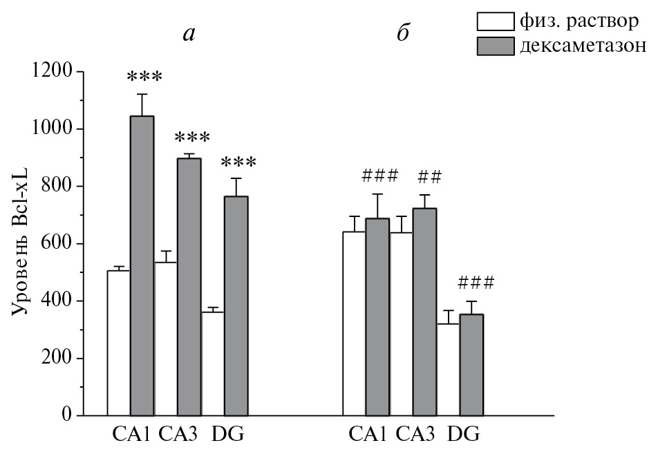 Рис. 4. Уровень Bcl-xL в областях гиппокампа неонатальных крысят через 6 часов (а) и 24 часа (б) после введения дексаметазона. ***р < 0.001 по сравнению с введением физ. раствора, ##р < 0.01, ###р < 0.001 по сравнению с соответствующими 6-часовыми группами.