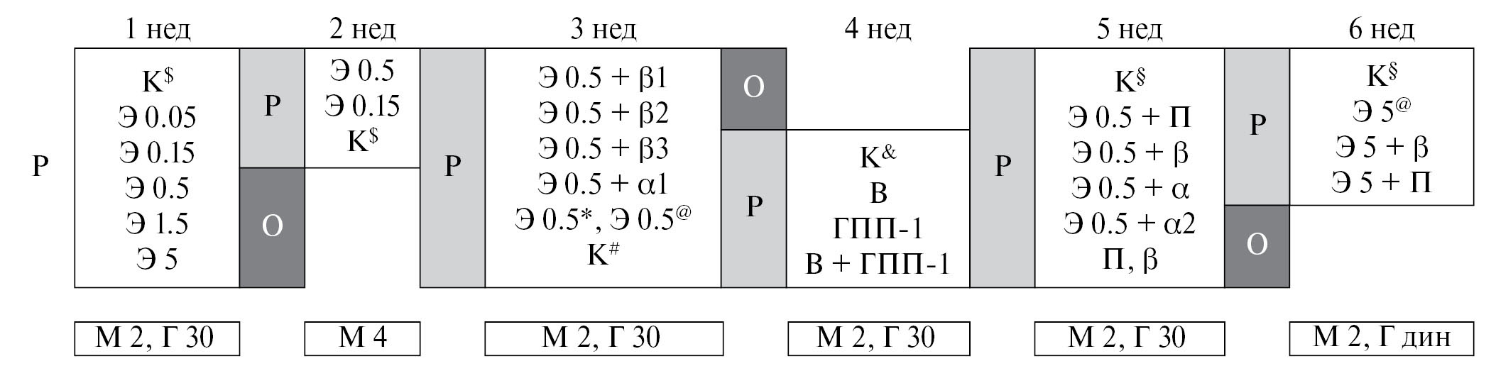 Р – рандомизация на группы (3, 4 или 6 групп по 10 животных в каждой), О – отдых, М 2 и М 4 – сбор мочи 2 и 4 часа, Г 30 и Г дин – определение глюкозы капиллярной крови из кончика хвоста на 30 мин или в динамике на 0, 30, 60, 90 и 120 мин эксперимента. Э 0.05, Э 0.15, Э 0.5, Э 1.5 и Э 5 – эксенатид в дозах 0.05, 0.15, 0.5, 1.5 и 5 нмоль/кг, ГПП-1 – глюкагоноподобный пептид-1 (1.5 нмоль/кг), В – вилдаглиптин (1 мг/кг), П – пентамин (30 мг/кг), α – фентоламин (1 мг/кг), α1 – доксазозин (1 мг/кг), α2 – раувольсцин (1 мг/кг), β – пропранолол (5 мг/кг), β1 – атенолол (2 мг/кг), β2 – ICI-118551 (1 мг/кг), β3 – L-748337 (1 мг/кг), К – контроль ($ – 0.9% раствор NaCl внутримышечно 1 мл/кг, # – 5% ДМСО внутрибрюшинно 1 мл/кг + 0.9% раствор NaCl внутримышечно 1 мл/кг, & – 0.9% NaCl внутрибрюшинно 1 мл/кг, § – вода для инъекций внутрибрюшинно 1 мл/кг + 0.9% раствор NaCl внутримышечно 1 мл/кг). В некоторых сериях дополнительно к эксенатиду в качестве контроля к антагонистам адренорецепторов вводили: @ – вода для инъекций внутрибрюшинно 1 мл/кг, * – 5% водный раствор ДМСО внутрибрюшинно 1 мл/кг