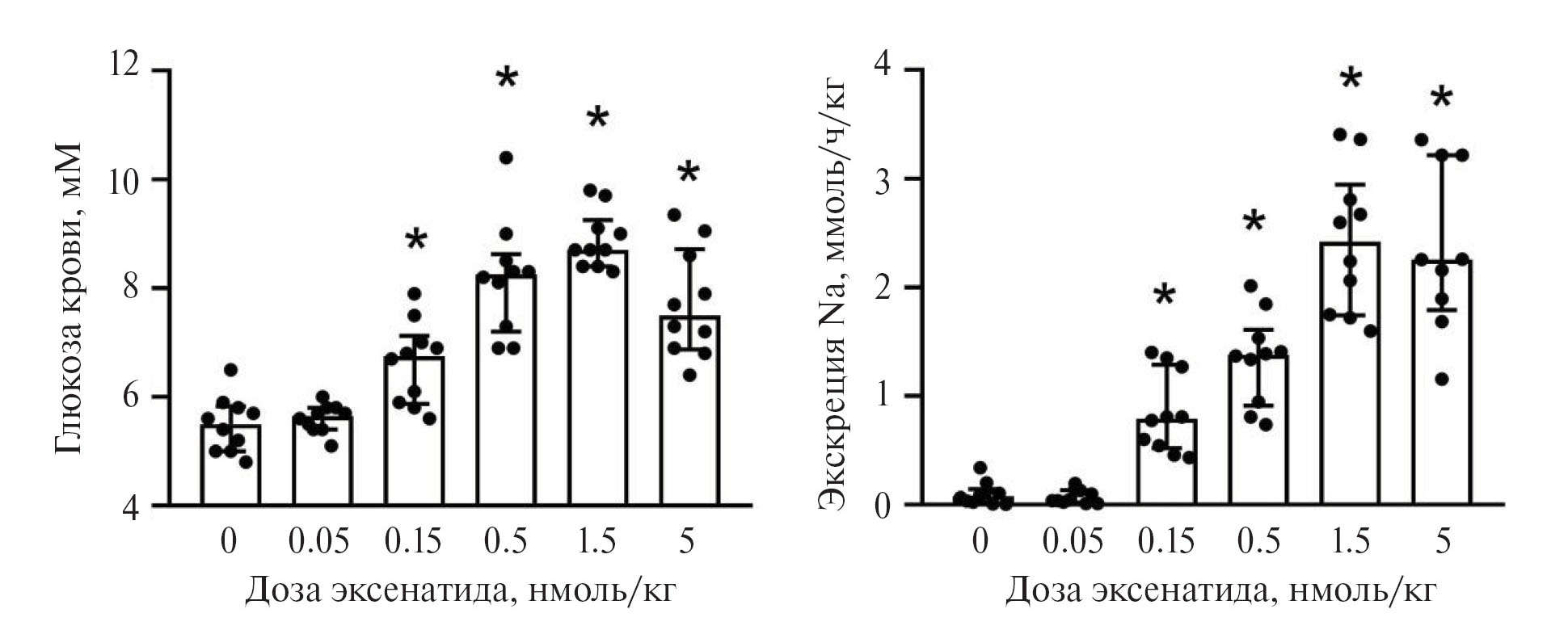 Рис. 2. Концентрация глюкозы в крови и экскреция ионов натрия с мочой у крыс после введения эксенатида в различных дозах