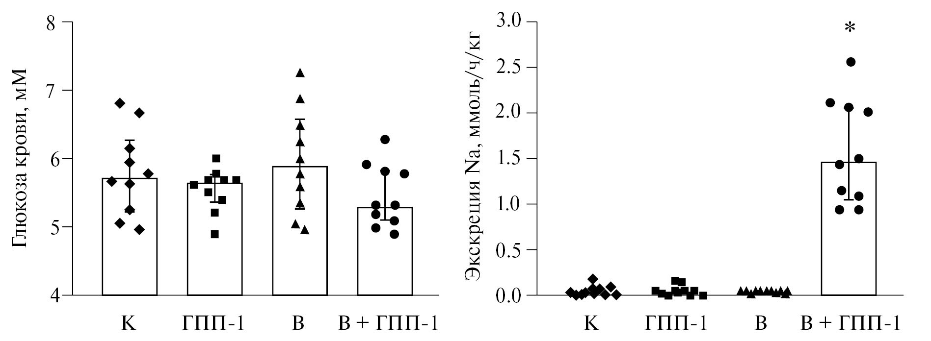 В отличие от эксенатида сам инкретин ГПП-1 в дозе 1.5 нмоль/кг не оказывал влияния на уровень глюкозы в крови животных (рис. 3). Концентрация глюкозы крови не отличалась от таковой в контрольной группе как при инъекции ГПП-1, так и при совместном введении ГПП-1 с ингибитором ДПП-4. Наблюдался рост экскреции ионов натрия почками при действии ГПП-1 совместно с вилдаглиптином. Натрийурез был сопоставим по величине с эффектом высоких доз эксенатида (рис. 3).