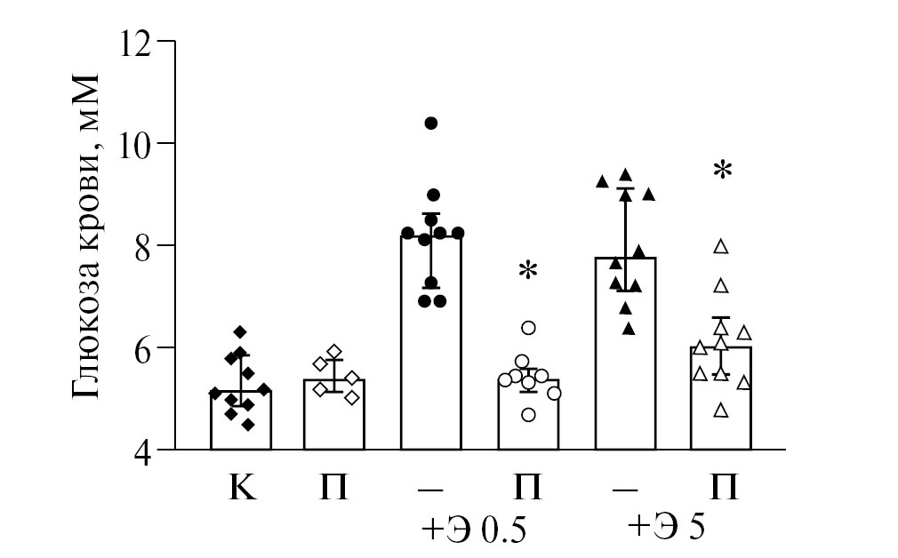 К – контроль (вода для инъекций внутрибрюшинно 1 мл/кг + 0.9% раствор NaCl внутримышечно 1 мл/кг), П – пентамин (30 мг/кг), Э 0.5 и Э 5 – эксенатид (0.5 и 5 нмоль/кг)