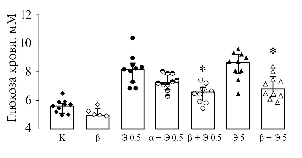 К – контроль (вода для инъекций внутрибрюшинно 1 мл/кг + 0.9% раствор NaCl внутримышечно 1 мл/кг), Э 0.5 и Э 5 – эксенатид (0.5 и 5 нмоль/кг), β – неселективный β-адреноблокатор пропранолол в дозе 5 мг/кг, α – неселективный α-адреноблокатор фентоламин в дозе 1 мг/кг