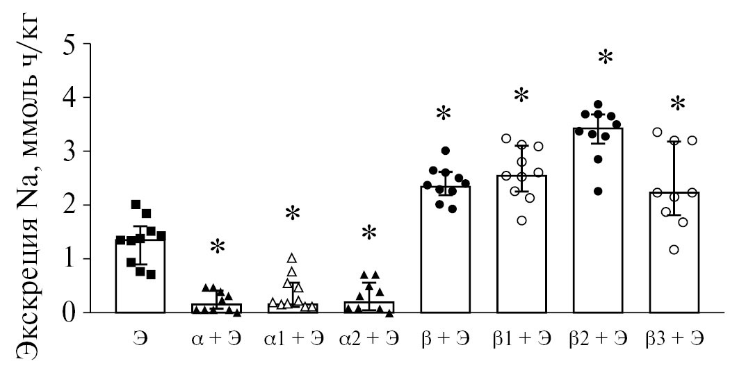 Рис. 9. Экскреция ионов натрия у крыс после введения эксенатида на фоне предварительной блокады адренорецепторов