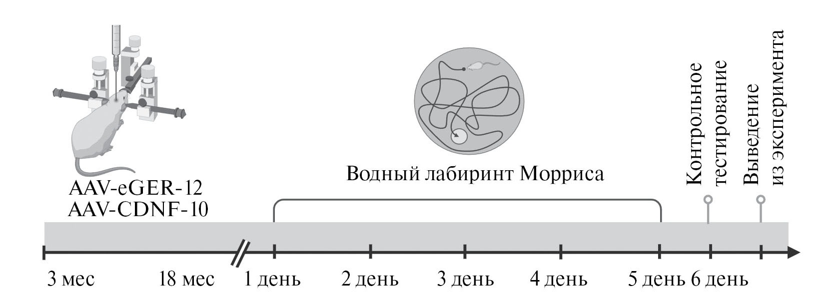 В возрасте 3 мес. животным осуществляли инъекцию аденоассоциированного вирусного вектора (AAV), кодирующего СDNF (AAV-CDNF, n = 10) или зелёный флуоресцентный белок (EGFP) (AAV-EGFP, n = 12). В возрасте 18 месяцев (что соответствует стадии прогрессии признаков БА) тестировали животных в водном лабиринте Морриса (рис. 1).