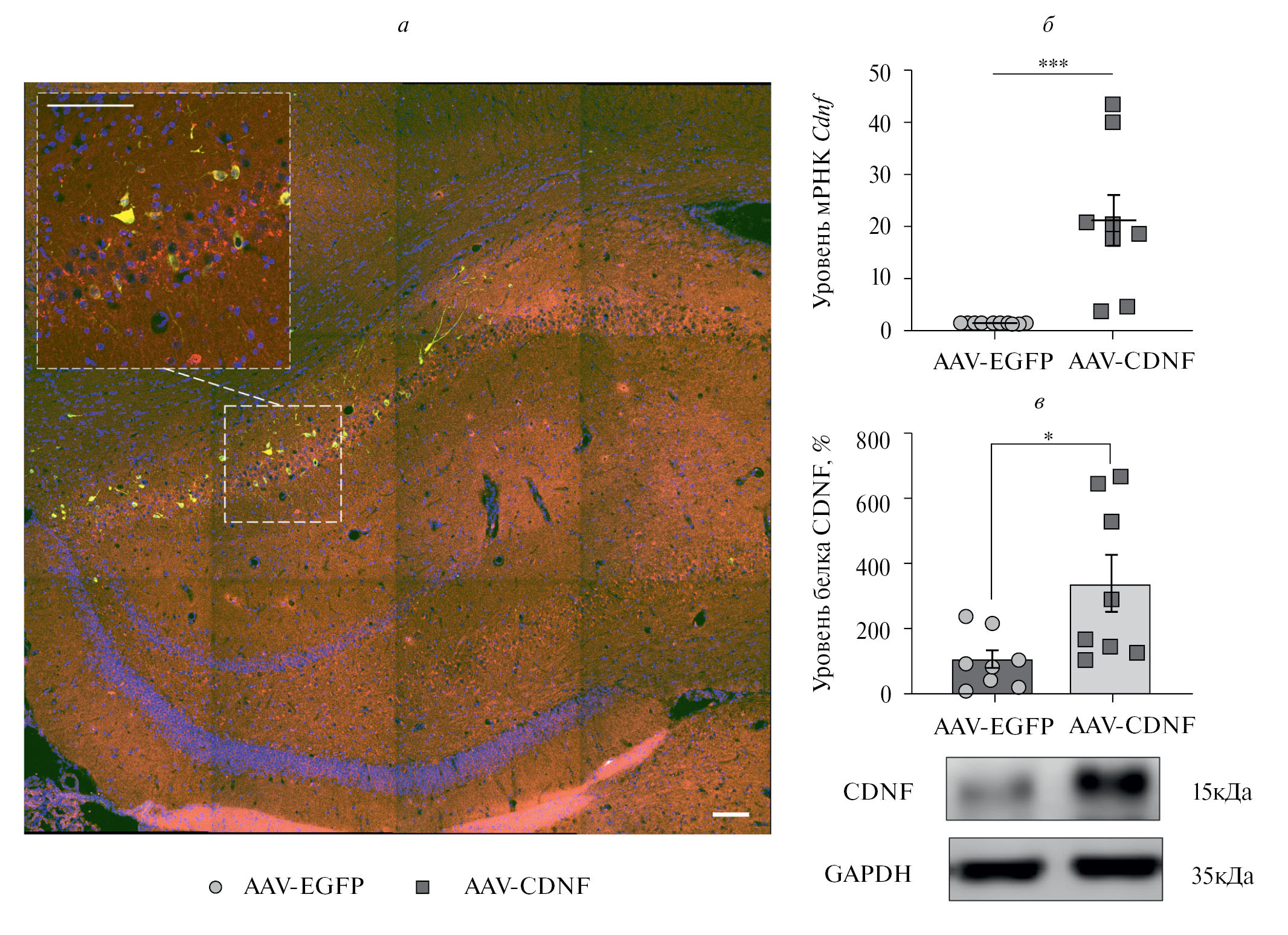 Вестерн-блот-анализ также показал, что уровень белка CDNF в гиппокампе экспериментальных животных значительно вырос (t = 2.59; df = 14; p = 0.0215; рис. 3в). Таким образом, была достигнута сверхэкспрессия CDNF в гиппокампе экспериментальных животных, что также было подтверждено данными микроскопии. По результатам иммуногистохимического окрашивания с кальретикулином, проведённому на срезах гиппокампа, было обнаружено, что экспрессируемый CDNF преимущественно локализуется в ЭПР (рис. 3а).