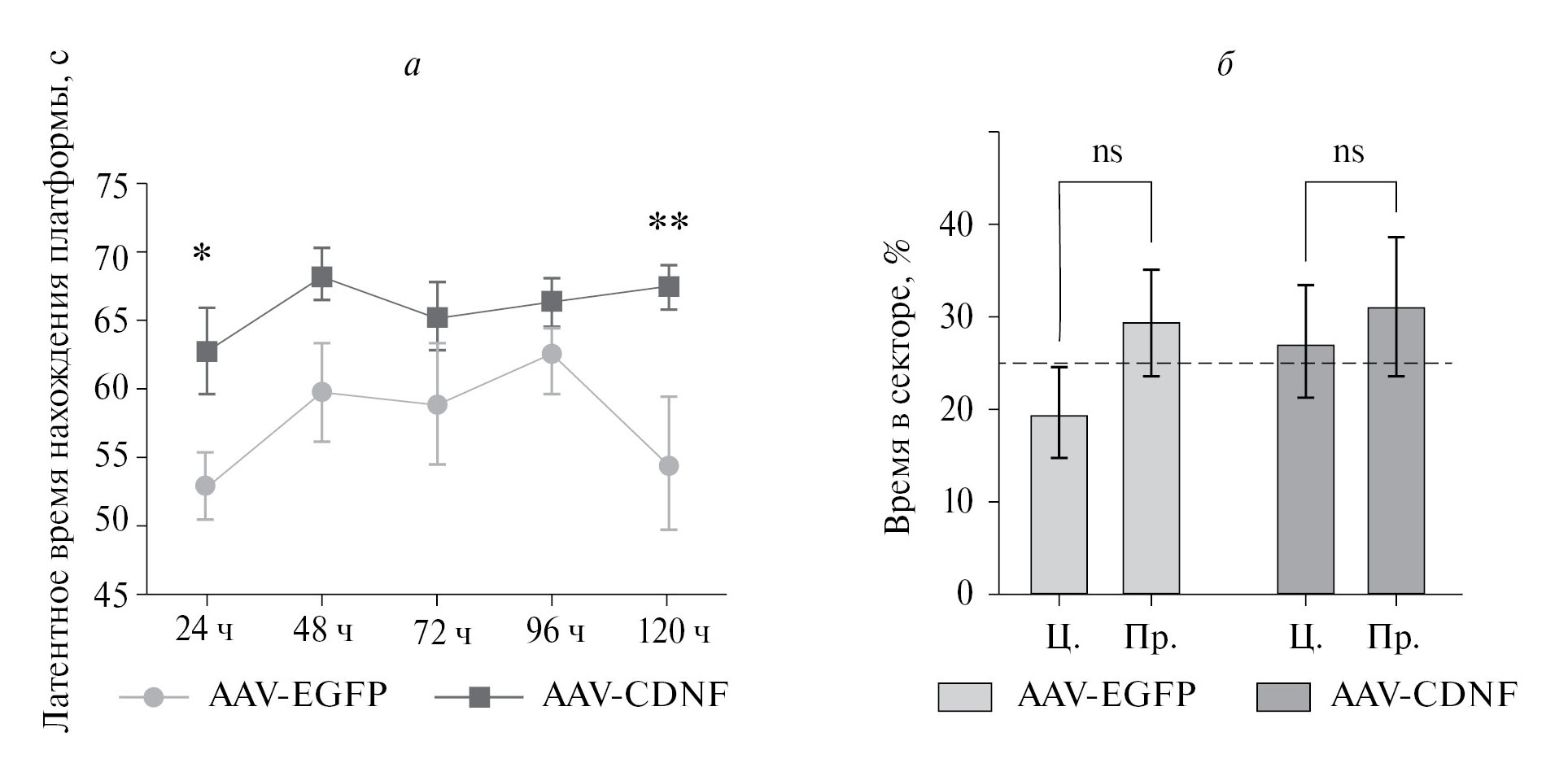Рис. 4. а – Латентное время нахождения платформы в тесте “водный лабиринт Морриса” для животных со сверхэкспрессией CDNF и животных контрольной группы; б – Контрольное тестирование для проверки качества формирования пространственной памяти. Время (%), проведённое в целевом секторе (Ц.): по сравнению с противоположным сектором (Пр.) и по сравнению с 25%-ной вероятностью случайного нахождения в целевом секторе (обозначено пунктирной линией). ** p < 0.01; * p < 0.05 – для группы AAV-CDNF по сравнению с AAV-EGFP