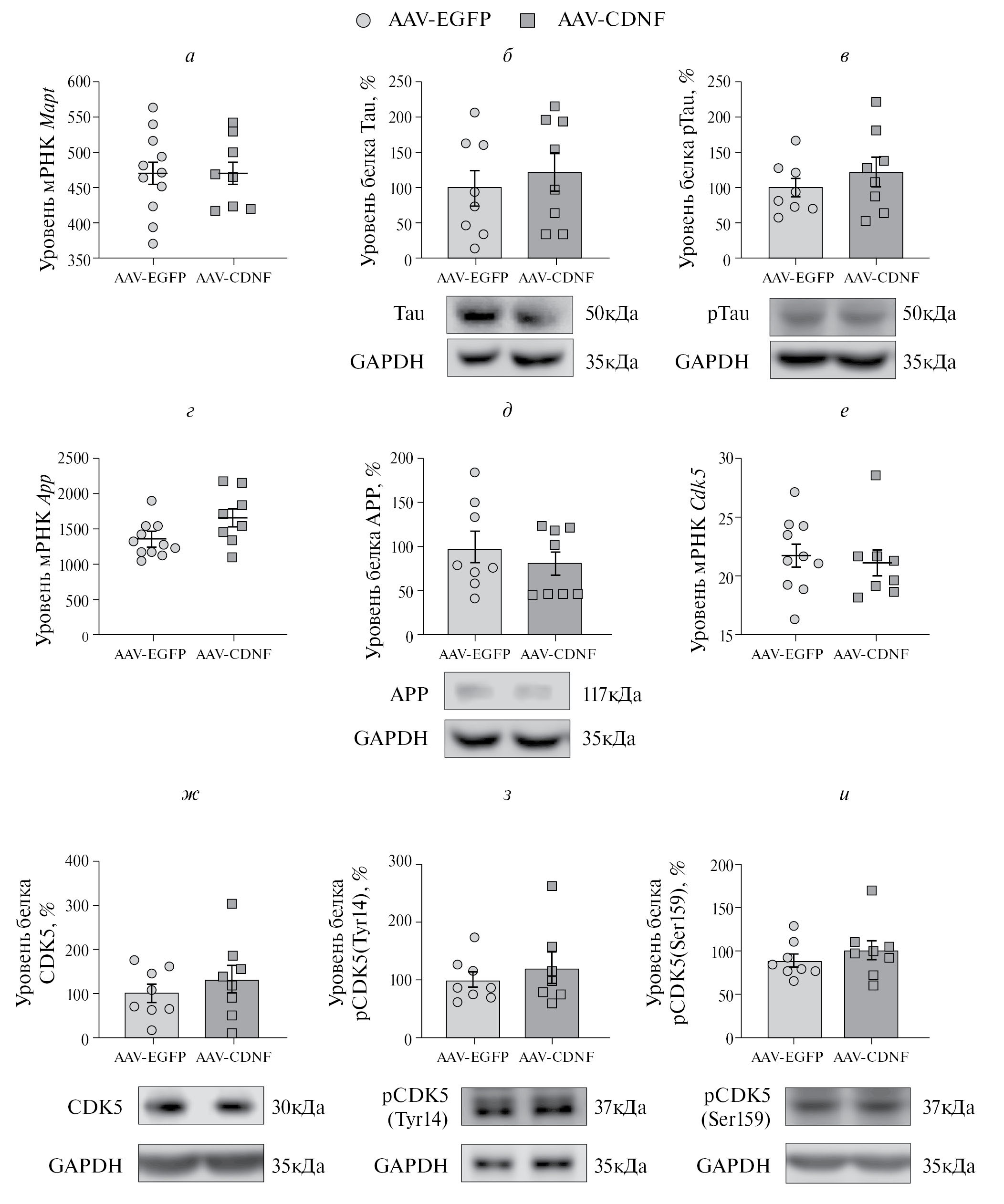 Влияние сверхэкспрессии CDNF на белки-маркеры БА. Также мы оценили экспрессию генов и уровень белка для основных маркерных белков БА. Сверхэкспрессия CDNF не оказала эффекта на экспрессию и уровень Tau-белка (рис. 5а, б) и APP (рис. 5г, д). Для Tau-белка был также оценен уровень фосфорилированной формы (рис. 5в), так как эта модификация, вероятно, является более информативным предиктором агрегации Tau-белка [29].