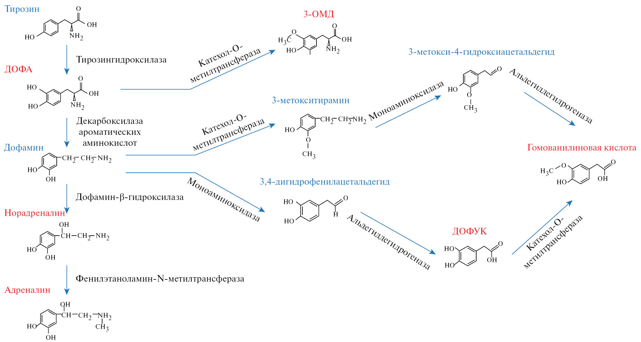 2ДОФА – L-3,4-дигидроксифенилаланин, 3-ОМД – 3-метокситирозин.