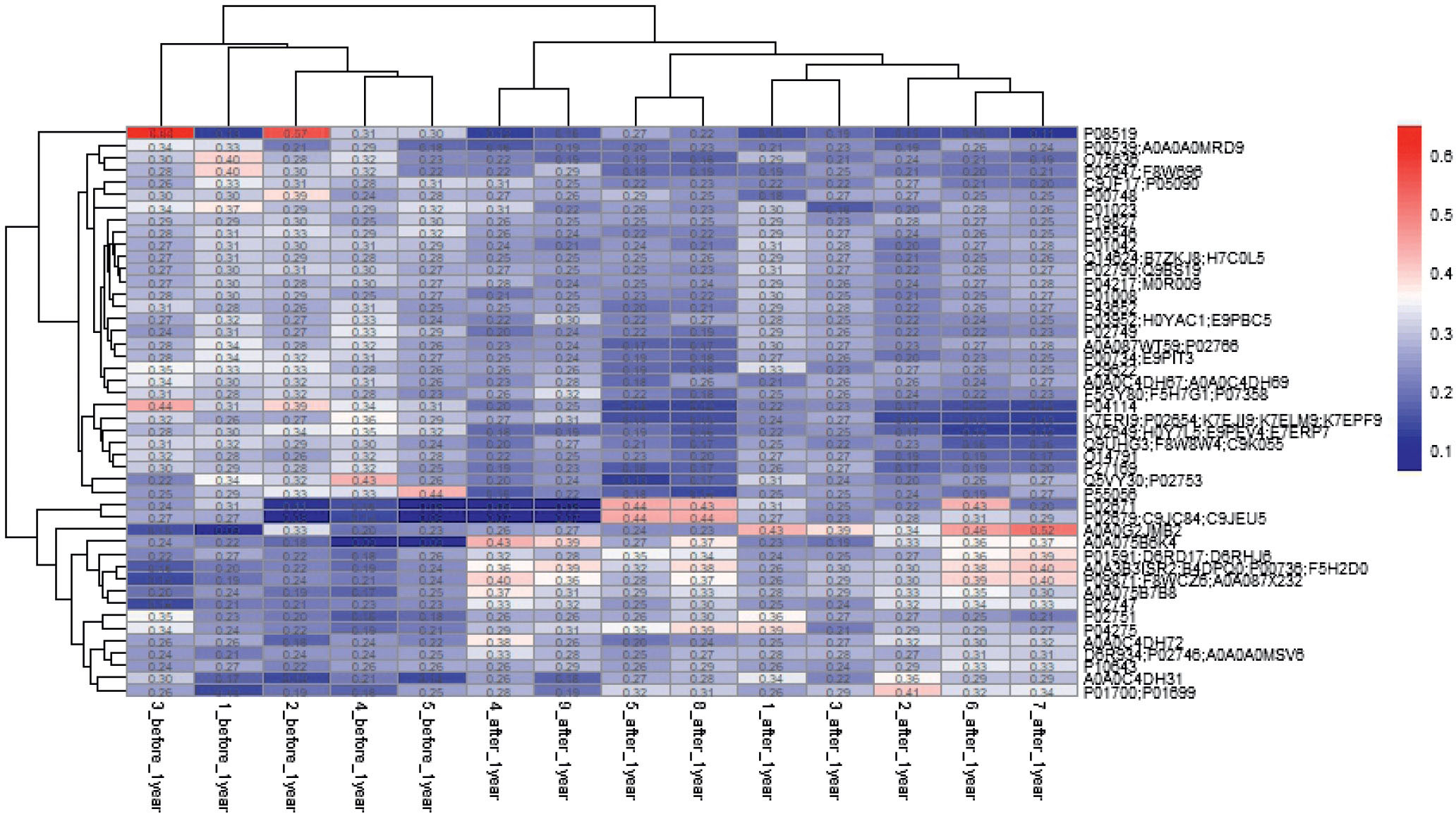 Сравнительный анализ уровней белков экзосом сыворотки крови пациентов, обследованных в периоды до года и более года после ИИ. На рис. 5 приведена тепловая карта, на которой представлены результаты иерархической кластеризации белков и образцов пациентов, обследованных до года и более года после ИИ.