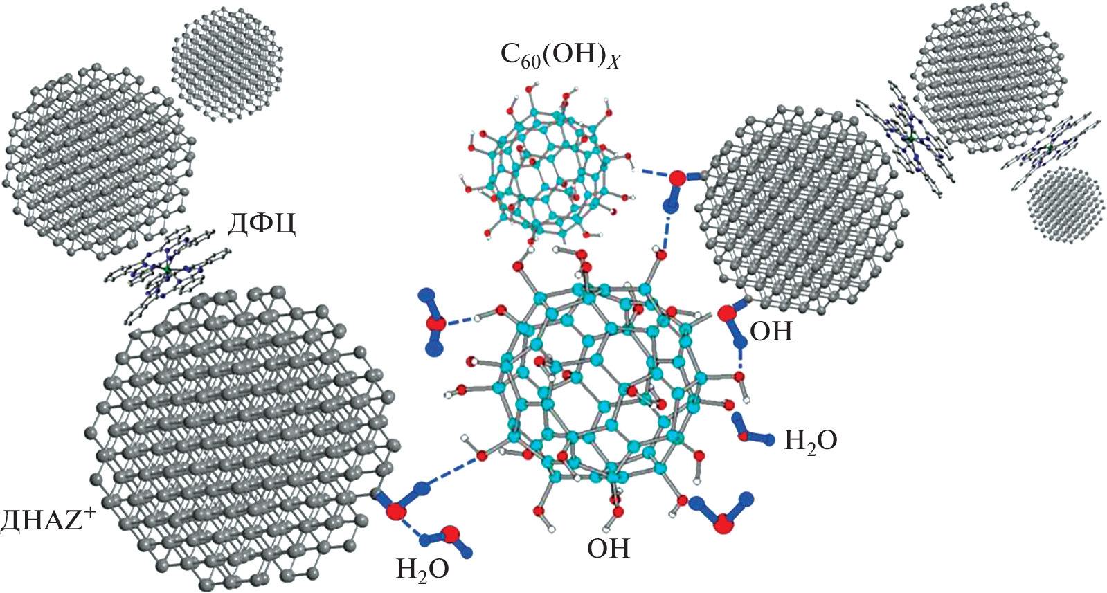 Впервые получены бинарные и тройные комплексы фуллеренов и дифталоцианинов европия с детонационными наноалмазами, способными служить платформами для доставки этих гидрофобных молекул в водные биологические среды для задач магнитно-резонансной томографии, фотодинамической терапии, диагностики с помощью люминесцентных меток. Детонационные наноалмазы (размер ~4–5 нм) имели положительный потенциал (30–70 мВ) в водной среде за счет привитых к поверхности групп (CH, COH) в результате термообработки в атмосфере водорода. При взаимодействии положительно заряженных алмазов с электроотрицательными гидратированными фуллеренами в водной среде исходные агрегаты каждого из компонентов разрушались, а электростатическое притяжение между ними приводило к формированию устойчивых компактных комплексов размером ~20 нм по данным динамического рассеяния света и рассеяния нейтронов в коллоидах (20°С). Бинарные комплексы включали в среднем по две молекулы фуллерена на 30–40 алмазных частиц. При введении молекул дифталоцианина в бинарный коллоид формировались устойчивые тройные структуры. Полученные комплексы алмазов, фуллеренов и молекул дифталоцианина перспективны для биомедицинских применений благодаря люминесцентным и магнитным свойствам компонентов.