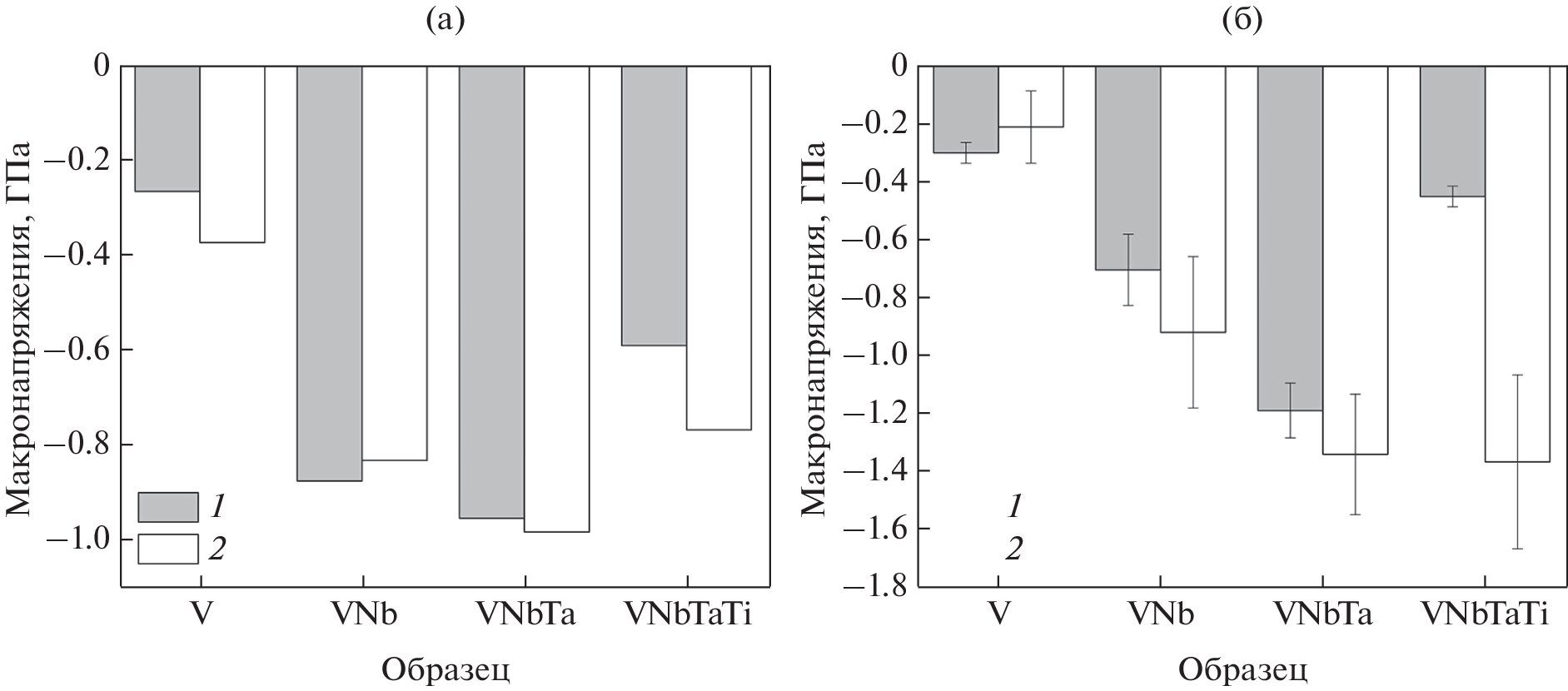 The aim of this work is to study the effect of irradiation with low-energy helium ions with a fluence 2 × 1017 cm–2 and an energy of 40 keV on the structural-phase state of multicomponent solid solutions based on V–Nb–Ta–Ti. These studies are aimed at obtaining new data on the radiation resistance of multicomponent solid solutions, which have great potential for use as structural materials for new generation reactors. As a result of the work carried out by scanning electron microscopy and X-ray diffraction analysis, it was found that all alloys of the system belong to equiatomic single-phase solid solutions and in the initial state, have a homogeneous distribution of elements on the surface and have compressive micro- and macro-stresses. The conducted studies have shown that irradiation with helium ions of alloys of the V–Nb–Ta–Ti system does not lead to the decay of the solid solution and disturbance of the equiatomicity and uniformity of the distribution of elements on the surface. Irradiation with helium ions does not lead to a significant change in the level of micro- and macro-stresses for VNb and VNbTa systems, while for VNbTaTi alloy there is an increase in compressive stresses, which may be due to the segregation of elements and the accumulation of helium-vacancy clusters.
