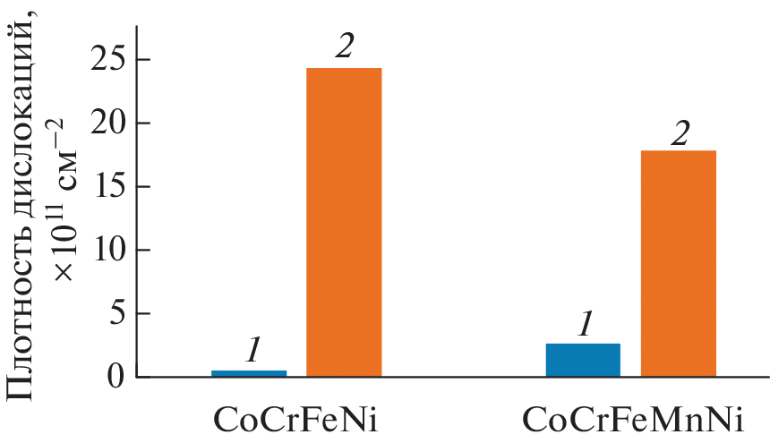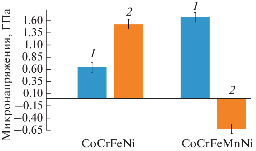In this study bulk samples of high-entropy alloys CoCrFeNi and CoCrFeMnNi, fabricated by arc melting (of pure metal powders up to 99.97%, argon atmosphere) followed by annealing (1150°C, 24 and 72 h) and cold rolling (85% decrease in thickness) were irradiated with He2+ ions (40 keV, fluence 2 × 1017 cm–2). Samples of CoCrFeNi and CoCrFeMnNi are substitutional solid solutions with a close to equiatomic composition and a uniform distribution of elements over the depth of the alloys. They have a coarse grain structure with a grain size of about 80 µm for CoCrFeNi and 100 µm for CoCrFeMnNi alloys. It was revealed that the surface microstructure, phase and elemental composition of high-entropy alloys are resistant to irradiation. No traces of radiation erosion and changes in the elemental and phase composition of the alloys were found. In alloys, the dislocation density increases, which leads to a decrease in the size of coherent scattering regions, and helium bubbles are also formed, leading to an increase in compressive macrostresses. It was found that tensile microstresses prevail in irradiated CoCrFeNi alloys, while compressive stresses prevail in CoCrFeMnNi alloys. It has been found that high-entropy CoCrFeMnNi alloys with a more complex composition are more resistant to radiation damage.