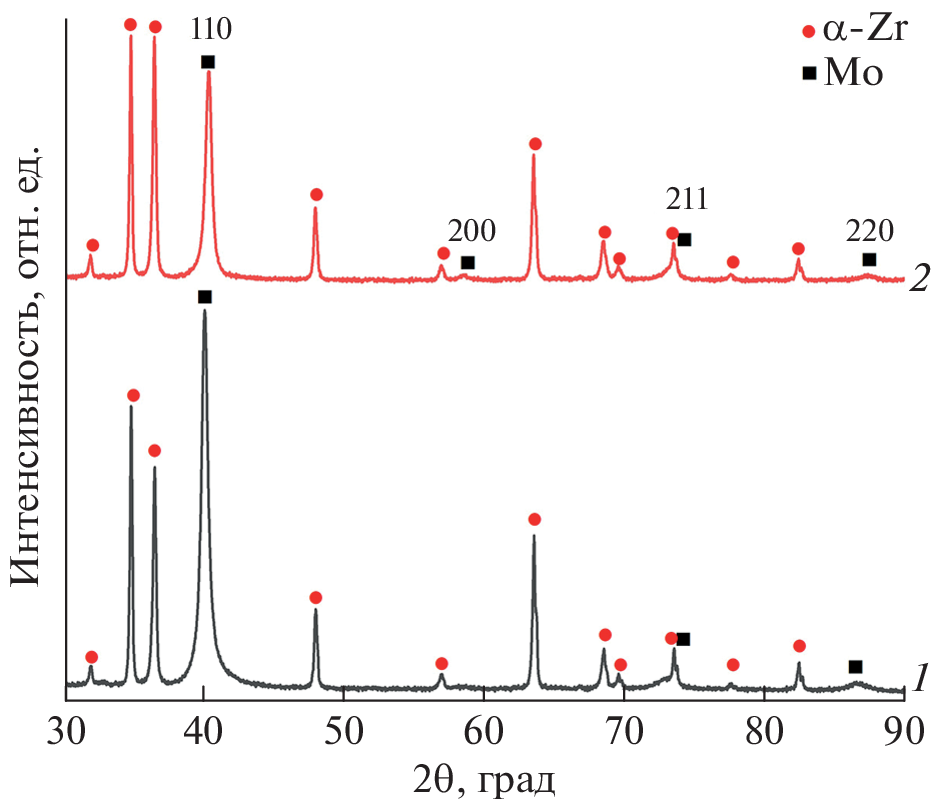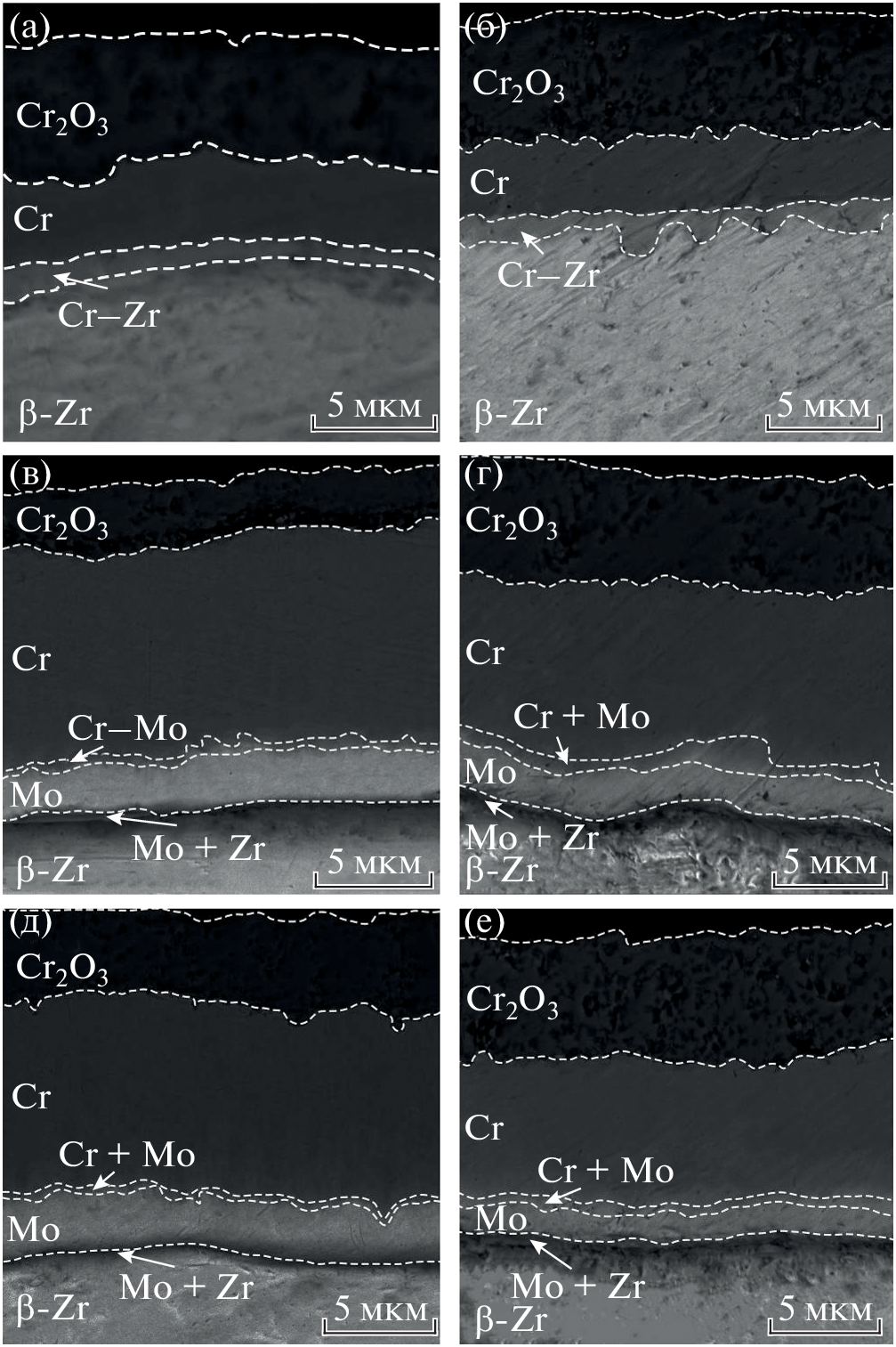 The effect of the crystal structure of the Mo sublayer on the resistance of the Zr–1Nb zirconium alloy with a Cr/Mo coating to high-temperature oxidation in air were studied. Three types of coating were deposited by magnetron sputtering: a single-layer Cr coating with a thickness of 8 μm, bilayer coatings with a Mo sublayer (3 μm) of various textures and an outer protective Cr layer (8 μm). Different textures of molybdenum layers were formed by changing the configuration of the magnetron sputtering system. Coated samples were oxidized in an atmospheric furnace at 1100°C for 15, 30, 45 and 60 min. The results of X-ray diffraction and scanning electron microscopy showed that applying Mo sublayer limited the Cr–Zr interdiffusion. Diffusion of Mo leads to the formation of interdiffusion layers Cr–Mo and Mo–Zr. Faster diffusion is observed at the Cr–Mo interface. The thickness of the residual Cr layer in bilayer coatings is greater than in a single-layer one under similar oxidation conditions.