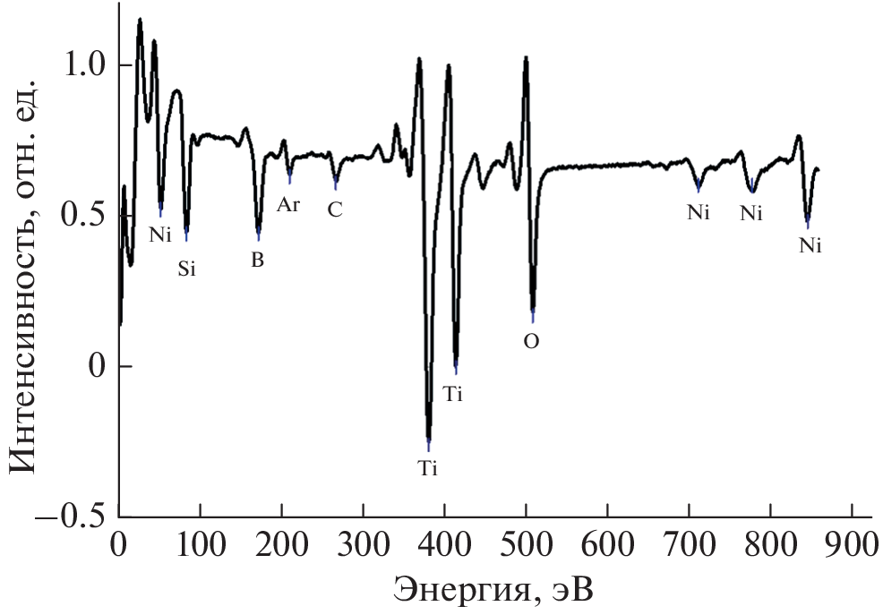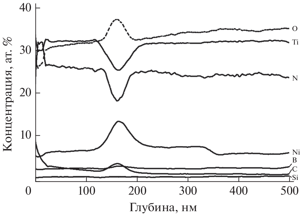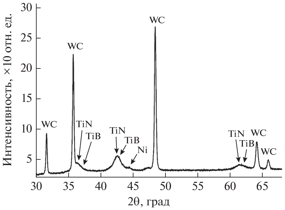 The article presents the results of a study of vacuum-arc coatings obtained by sputtering Ti–B–Si–Ni cathodes, manufactured by the method of self-propagating high-temperature synthesis with simultaneous pressing. The techniques for manufacturing cathodes of the indicated composition were characterized; the modernized NNV 6.6-I1 device, the conditions and modes of coating deposition in an argon atmosphere and in a nitrogen + argon gas mixture in a ratio of 90/10 were described. To study the physical and mechanical properties of the resulting coatings, the hardness was measured at different loads on the indenter; the strength of adhesion to the base was assessed by the Rockwell method; the elemental composition of the cathodes and the (Ti–B–Si–Ni)N coating was determined by Auger spectroscopy and the phase composition of the (Ti–B–Si–Ni)N coating was determined by X-ray phase analysis; a study of the properties of the coating (Ti–B–Si–Ni) was carried out by the scratching method (scratch testing). As a result of a comprehensive analysis of the results obtained, it was concluded that the high hardness of the (Ti–B–Si–Ni)N coating (more than 40 GPa) is due to its composition, which includes both nitrides and highly hard titanium borides. The heterophasic nature of the structure of this coating can serve as a contribution to the stressed state of the material. The coating has a gradient-layered structure. The material contains a Ti–B–Si–Ni layer bonding with the substrate and the main functional layer (Ti–B–Si–Ni) N. The coating has both high hardness and sufficient adhesion to the substrate (adhesion) determined by the scratch testing. The combination of these properties makes the material promising for its practical application in the production of tools.