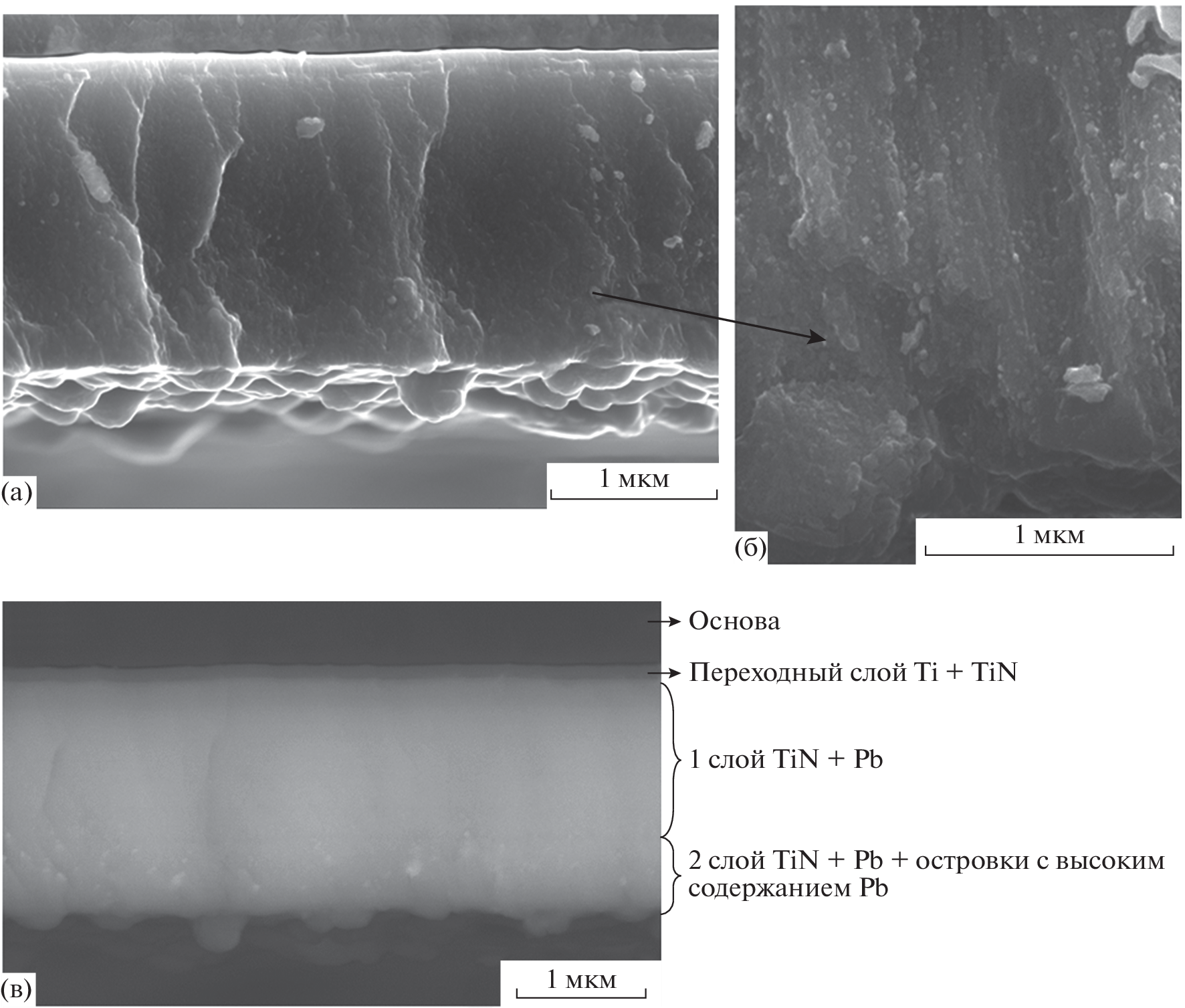 Сomposite solid lubricating coatings TiN–Pb with a thickness of ~2 μm were produced by co-sputtering of Ti and Pb cathodes of two separate magnetrons on titanium alloy VT6. The Pb content in the coating averages ~12 at. %. The inner layer is coating characterized by a uniform distribution of Pb, and the upper layer is characterized by the presence of islands with a high content of Pb. The coating structure is globular, predominantly containing nanometer-sized crystallites. The absence of a columnar structure of the coating is associated with a high content of Pb, which is insoluble in the TiN matrix and interrupts the growth of crystallites. X-ray diffraction analysis showed the presence of Pb, PbO, and TiN phases in the coatings. The diffraction lines are broadened, which indicates that the crystallite size is ~10–20 nm in the coating. Tribological tests of the TiN–Pb coating were carried out under conditions of low-amplitude friction – fretting wear in a wide range of loading parameters. In the full slip mode, a friction coefficient of ~0.25 is observed. During the transition from the full slip mode to the reciprocating slip mode, the energy dissipated during friction drops by more than three times, which is also reflected in a sharp decrease in the friction coefficient from 0.25 to 0.05.