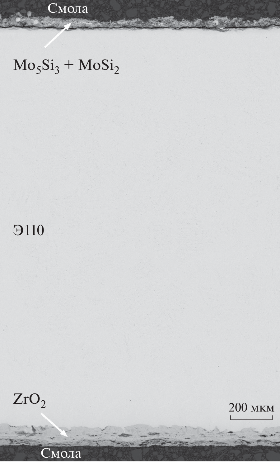 The work is devoted to an experimental study of the possibilities of applying a protective silicide coating on an alloy based on zirconium (E110) by atmospheric plasma spraying. Coatings based on the binary eutectic Mo5Si3 + MoSi2 were deposited on the surface of E110 alloy sheet. The features of the structure and phase composition of the coatings after deposition and their evolution as a result of isothermal annealing at a temperature of 1300°C are studied. Upon rapid cooling of silicide particles during coating, nonequilibrium phases are formed. As a result of annealing, the phase composition changes, which corresponds to the phase diagram. The kinetics of diffusion interaction between the coating and the base material has been studied. The possibility of successfully protecting a zirconium alloy from oxidation at 1100°C in air by complex deposition of a coating of molybdenum silicides has been shown for the first time. The minimum radius of curvature of the surface of the protected samples was about 1 mm.