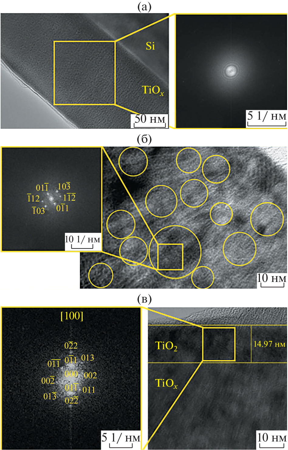 Annealing of amorphous TiOx films obtained by electron-beam evaporation under atmospheric conditions at temperatures from 300 to 400°C is found to lead to the formation of an anatase crystalline phase. According to Raman spectroscopy data, the increase in the fraction of the the crystalline phase stops at an annealing temperature above 350°C. According to the results of X-ray phase analysis, the average crystallite diameter is about 23 nm. Electron microscopy studies have shown that, upon annealing, the near-surface layer (15 nm thick) crystallizes in the films, and TiO2 nanocrystals with sizes from 4 to 10 nm are formed in the bulk. As the depth increases, the number of nanocrystals decreases.