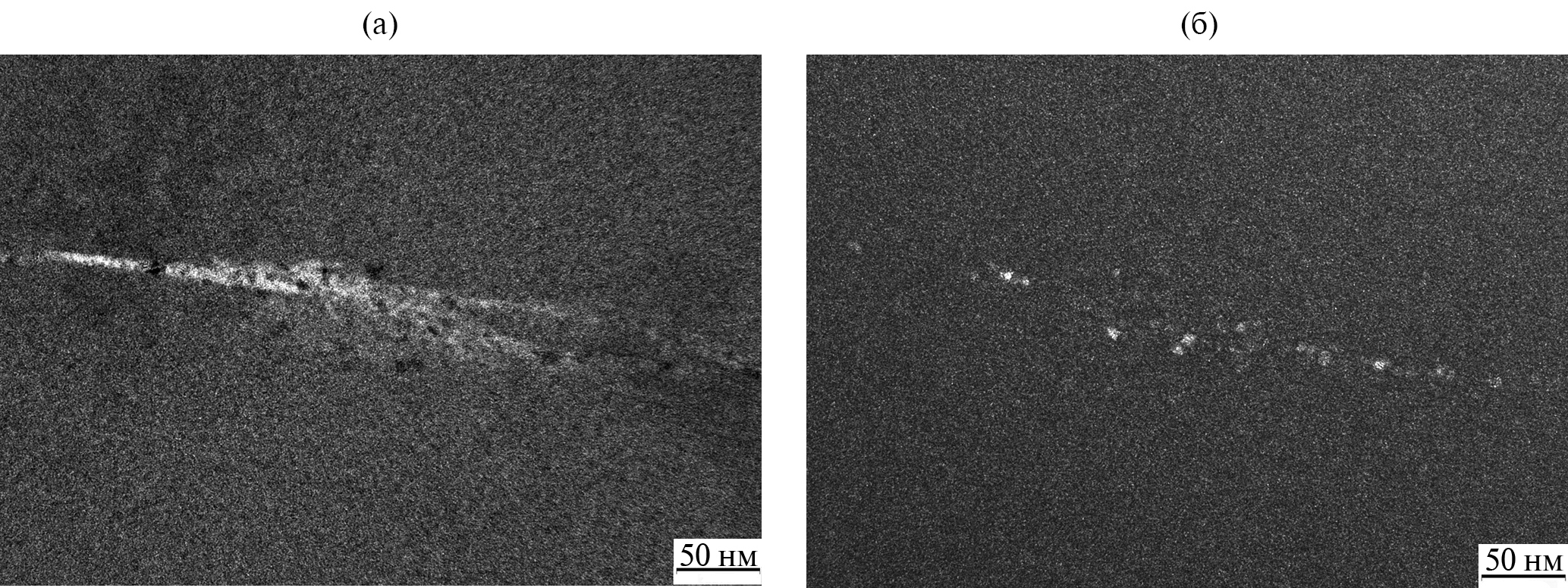 На рис. 1 показана поверхность аморфного сплава Al87Ni8La5 после прокатки. Величина деформации составляла (h0–h)/h0 = 0.05. На изображении видны ступеньки, появившиеся в результате деформации. Расстояние между ступеньками было непостоянным и составляло в среднем около 1 мкм. Ступеньки образуются в результате выхода ПС на поверхность. Такая полоса сдвига изображена на рис. 2. Толщина ПС меняется от 4 до 30 нм. В ПС присутствуют отдельные нанокристаллы. Размер нанокристаллов, определенный по темнопольному изображению (рис. 2б), находится в диапазоне 4–8 нм. Нанокристаллы представляют собой частицы алюминия. На рис. 3 представлено полученное с помощью электронной микроскопии высокого разрешения изображение ПС с нанокристаллами Al размером приблизительно 5 нм, толщина ПС на этом участке также около 5 нм. Количество нанокристаллов в ПС невелико, наблюдаются участки полосы без нанокристаллов.