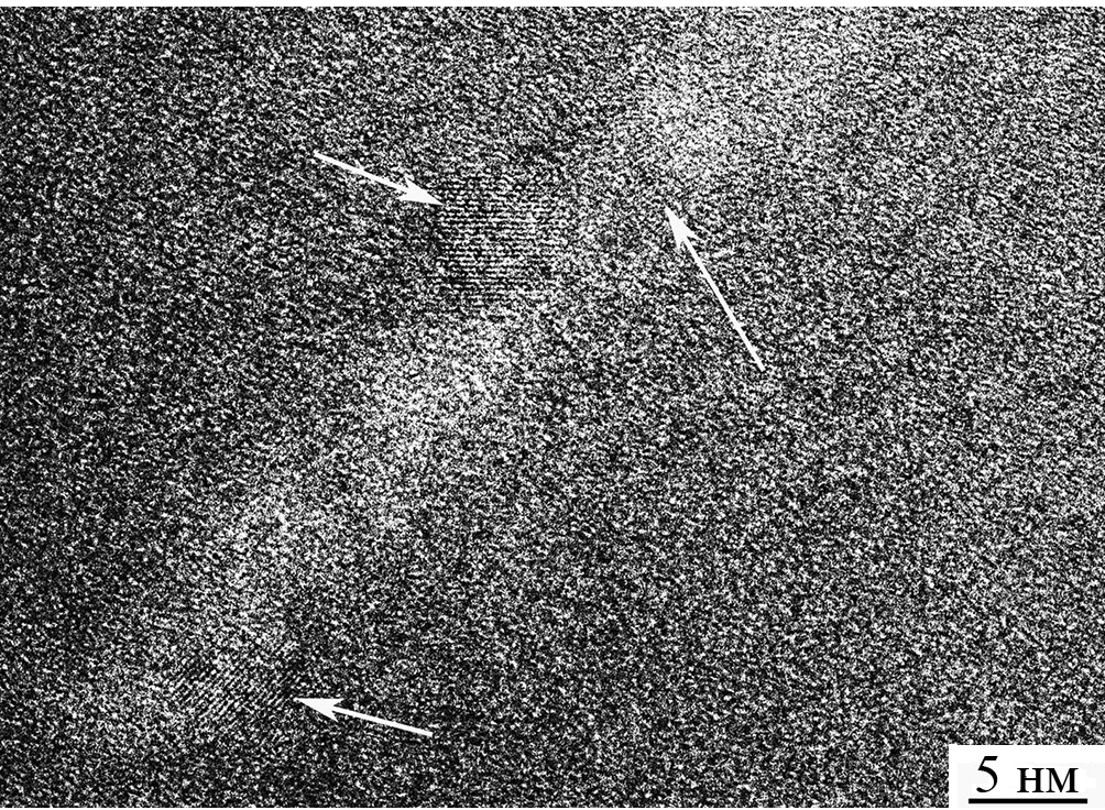 Рис. 3. Изображение ПС сплава Al87Ni8La5 с нанокристаллами (указаны стрелками), полученное с помощью электронной микроскопии высокого разрешения.