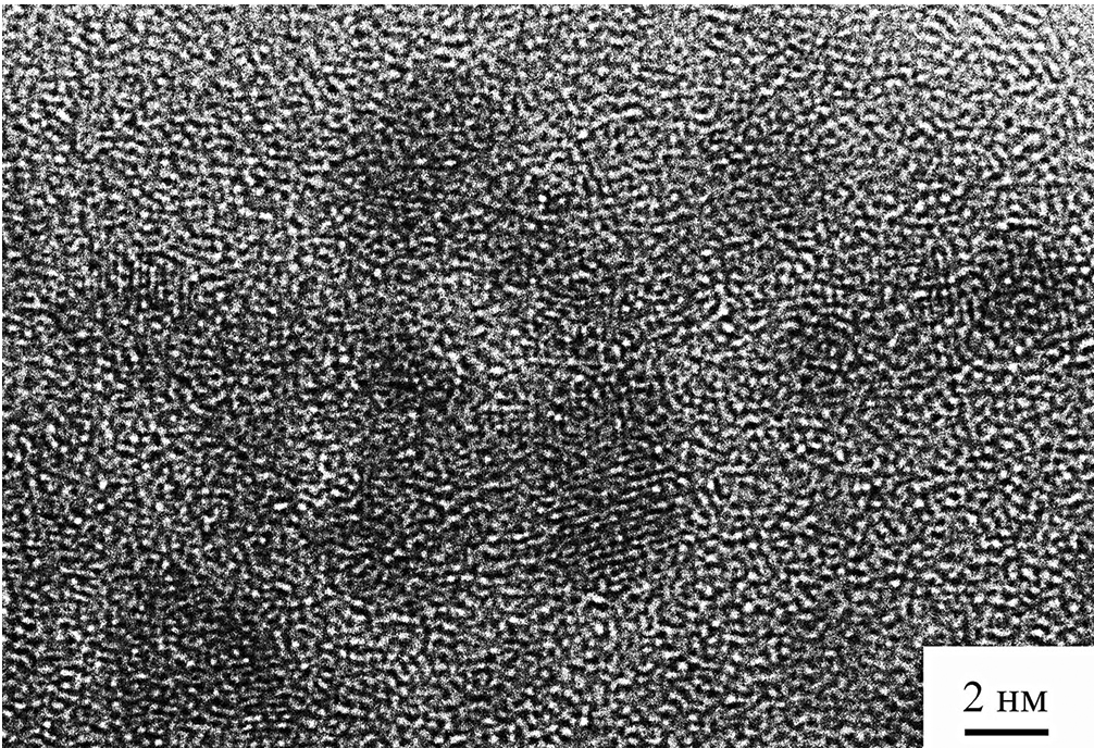 Рис. 5. Изображение сплава Al87Ni8La5 после КВД (e = 6.5), полученное с помощью электронной микроскопии высокого разрешения.