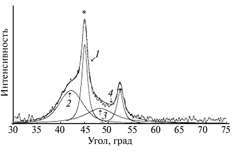 Рис. 6. Ренгенограмма сплава Al87Ni8La5 после КВД (e = 6.5) в области первого диффузного максимума. Показаны: экспериментальная кривая (1); суперпозиция диффузных отражений от гетерогенной аморфной фазы (кривые 2 и 3) и дифракционных отражений (кривые, помеченные звездочками); суммарная кривая (4).