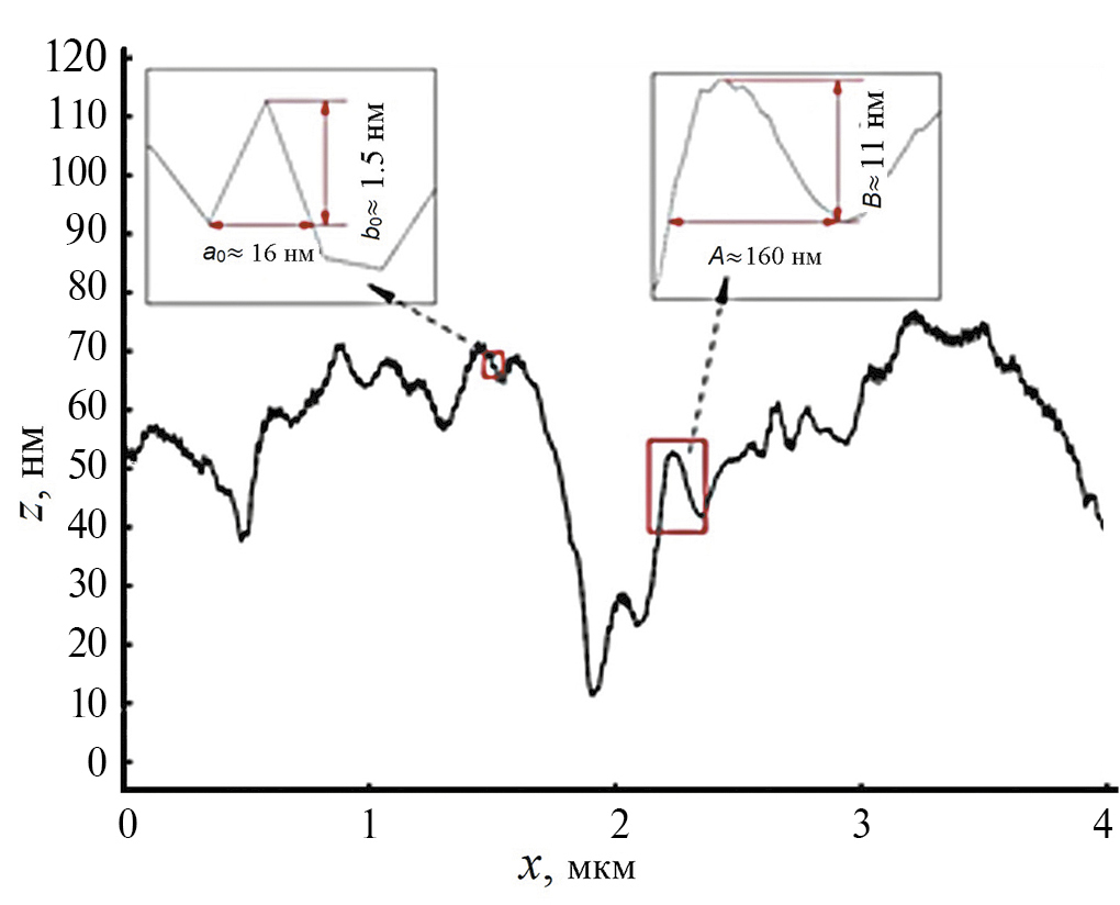 Методом атомно-силовой микроскопии были получены изображения (рис. 9) с участков поверхности размером 4×4 мкм (512×512 точек). Расстояния между ближайшими точками составило 7.8 нм. Ступеньки на поверхности после КВД имеют сложную форму. Эта форма напоминает форму изрезанного долинами горного хребта переменной высоты. Аналогичную форму ступенек наблюдали и при деформации аморфного сплава Al87Ni8La5 [14]. На рис. 10 приведен профиль поперечного сечения образца после КВД. Видно, что поперечный размер минимальных (элементарных) ступенек составляет 16–18 нм и высота ступеньки – от нескольких десятых долей нм до 1.5 нм. Элементарные ступеньки объединяются, образуя большую ступеньку. Как видно, размер таких больших (они тоже могут быть разного размера) составных ступенек довольно точно совпадают с размером некоторого целого количества элементарных ступенек.